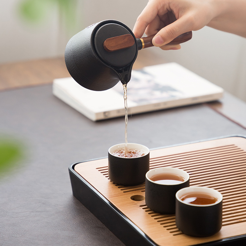 Black pottery teapot side handle pot single pot ceramic inlaid tin wood handle teapot Japanese antique pot stone scoop pot heat-resistant tea set