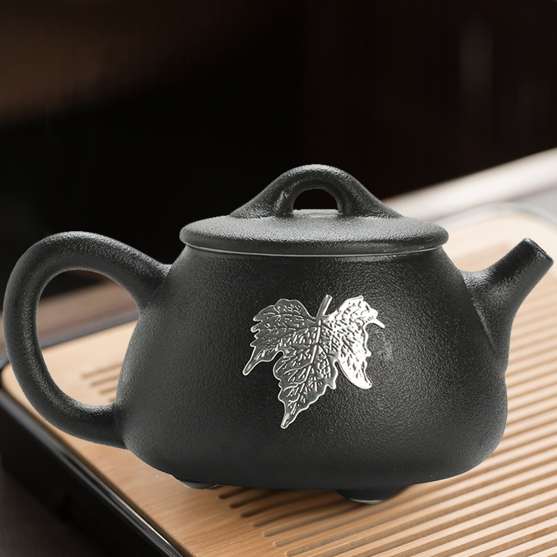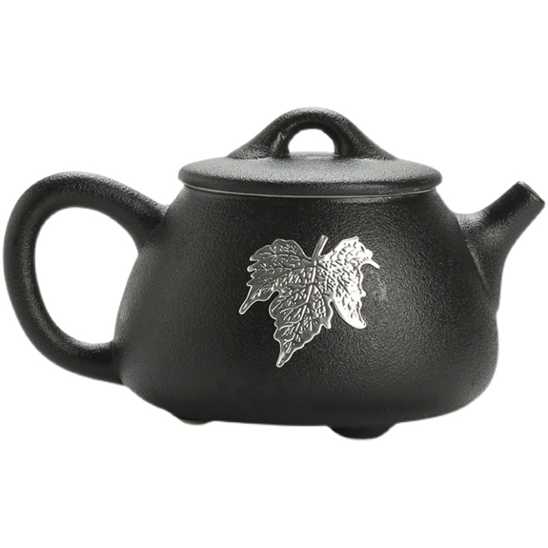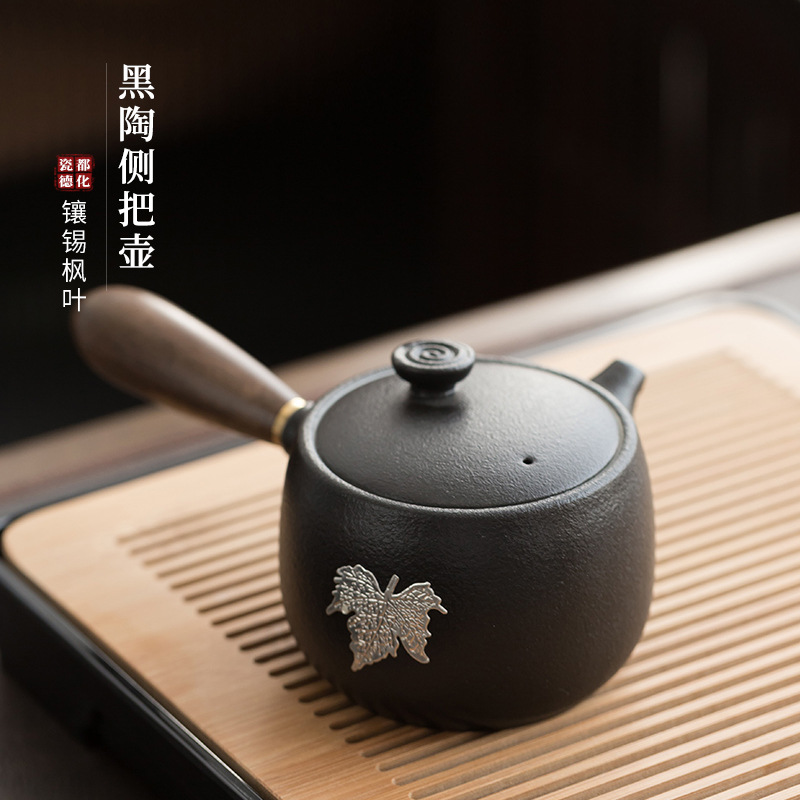 Black pottery side handle Maple leaf Qiankun pot black pottery side handle Maple leaf thread pot black pottery maple leaf stone ladle pot