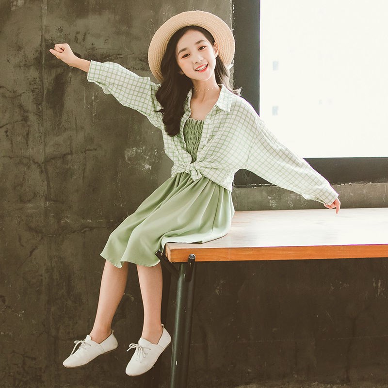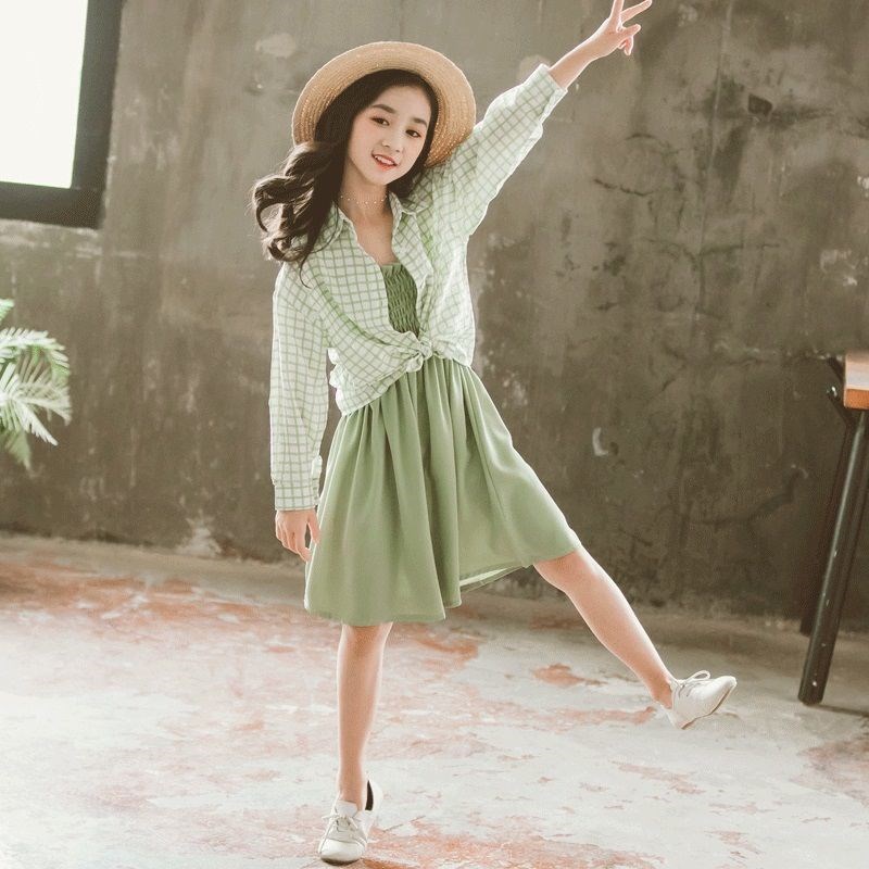 Girls dress suit spring and autumn new style 12-year-old girl girlfriends dress sunscreen clothes suspenders princess skirt two-piece set