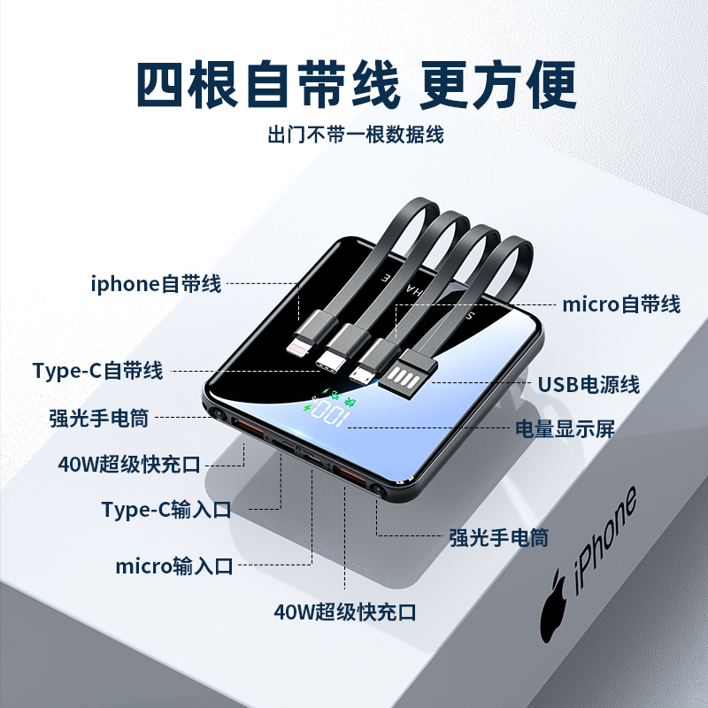 Super fast charging 40W Mobile charging ultra-thin small portable mini Bring your own line Large capacity 20000 mAh applicable Huawei Apple Vivo Xiaomi Phone Private Custom twenty thousand Action Power Supply