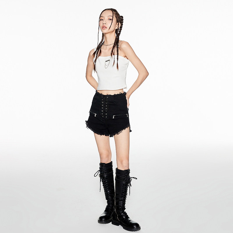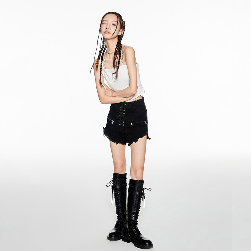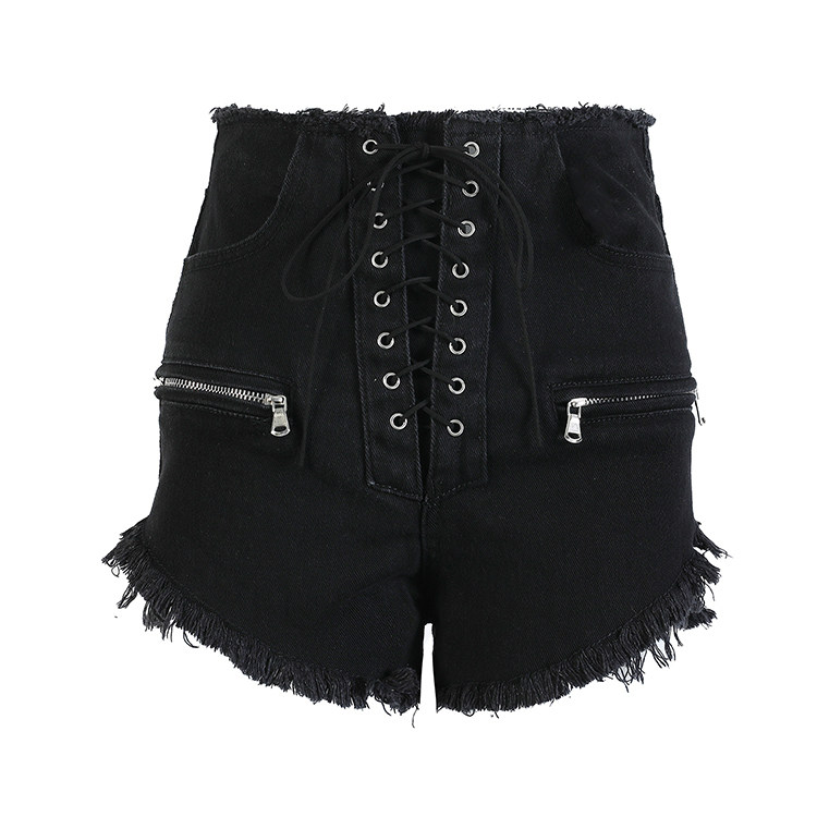 VIA PITTI shorts Women summer denim casual pants sexy drawstring strap zipper high waist burrs hot pants Black