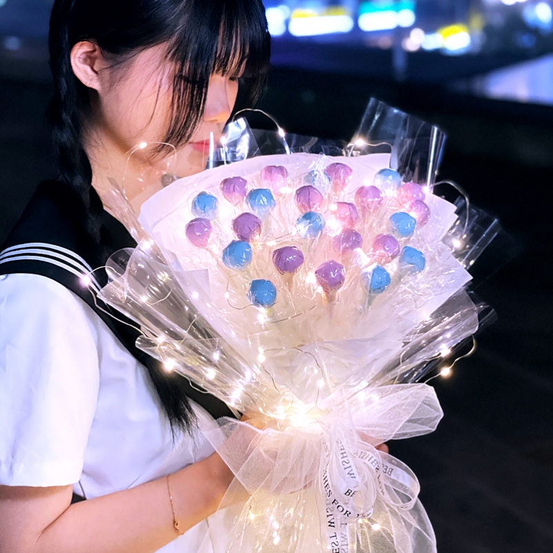 (Non-finished products) are all materials including tutorials. Packages do not include sugar. Snacks need to bring their own super (luminous fairy yarn) transparent lollipop bouquet 5 (mini luminous macarons) can pack 21 sugars