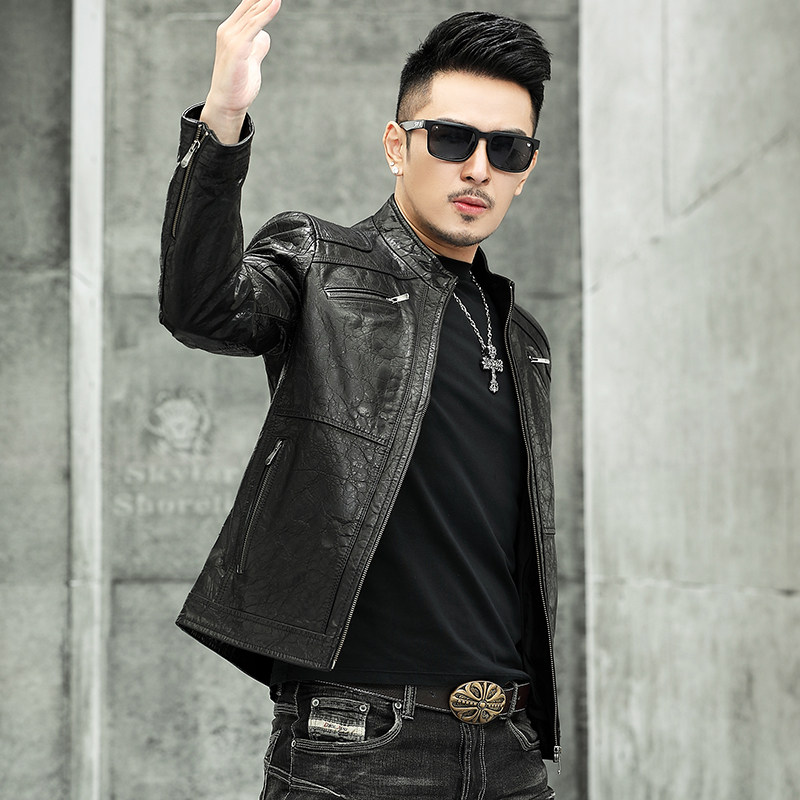 Real leather clothing male short section imported retro made of old calf leather oil wax leather upright collar with leather jacket locomotive jacket