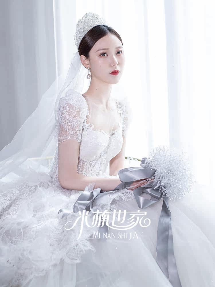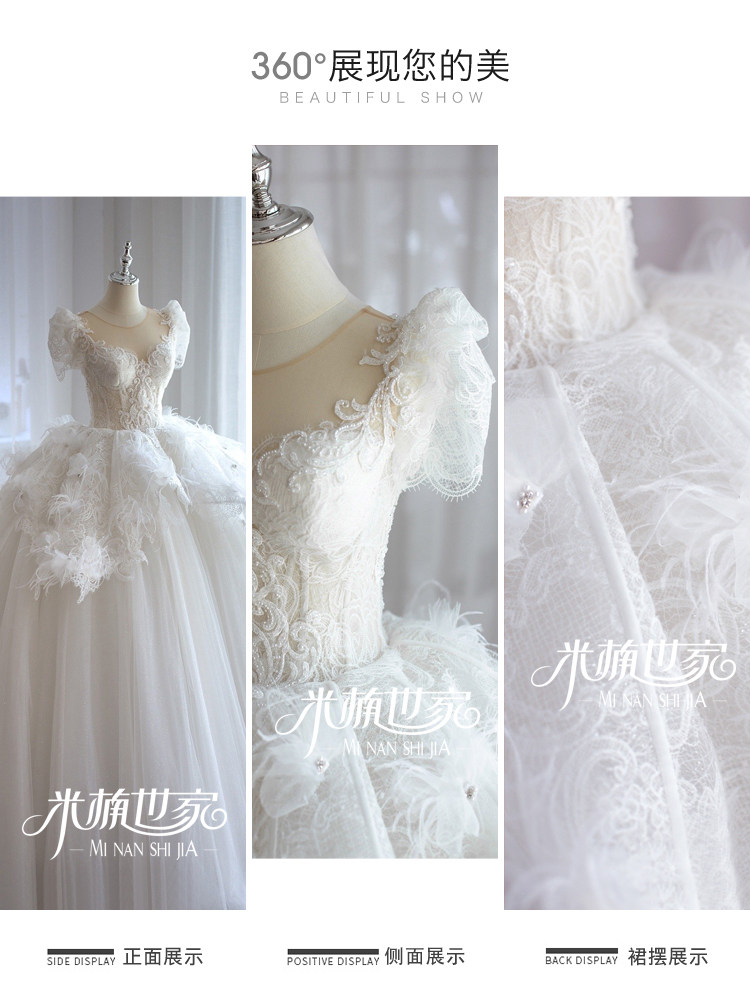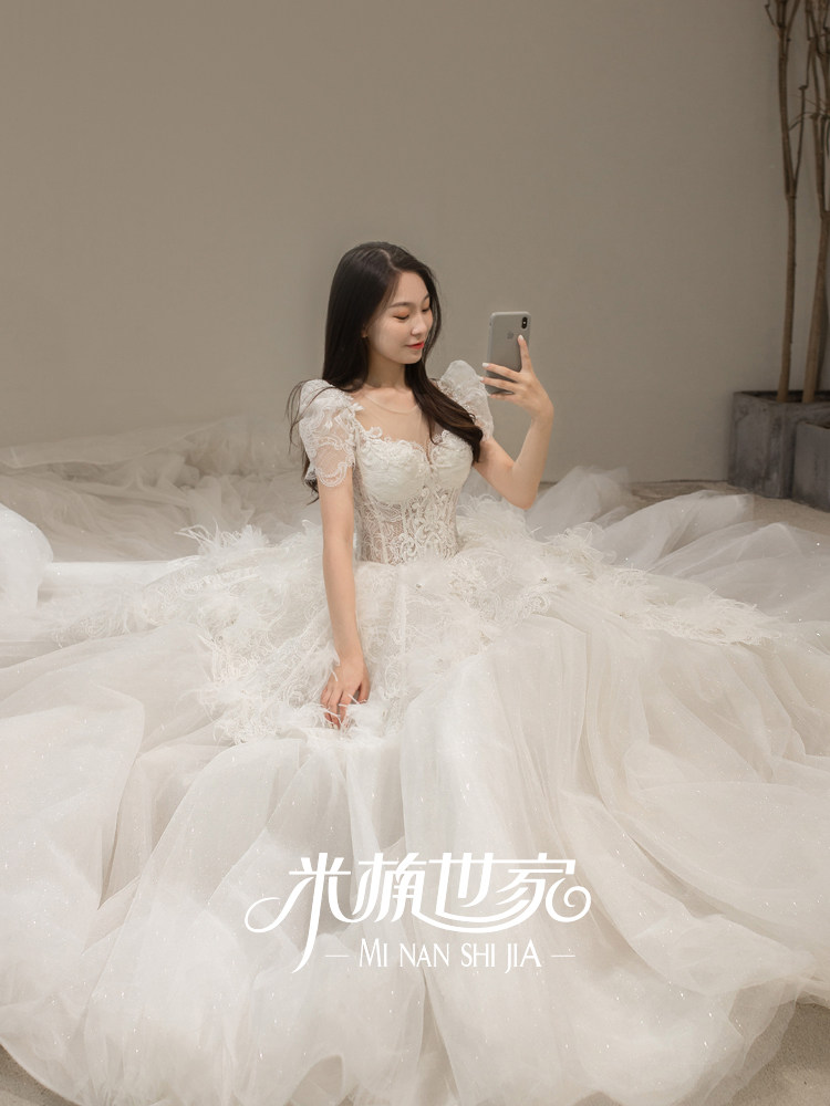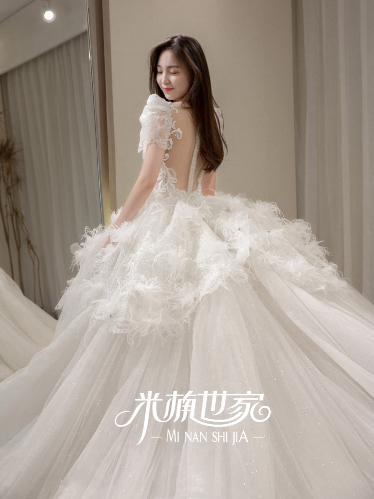 Fugitive princess new big trailing main wedding dress Extravagant Twinkle Feather Lace Fluffy Skirt Eurostyle Bubble Sleeve