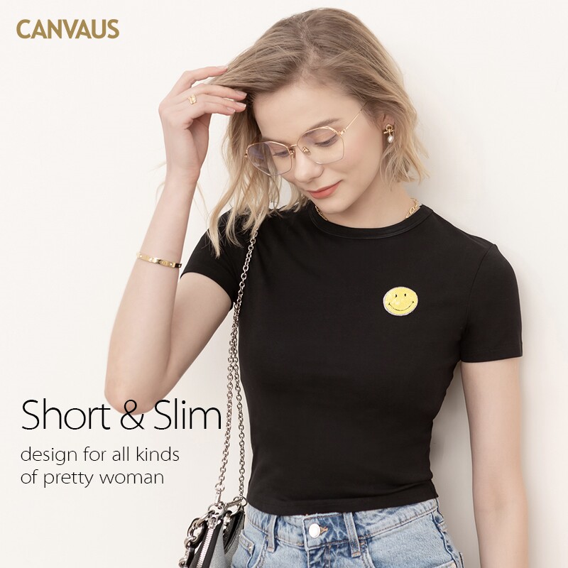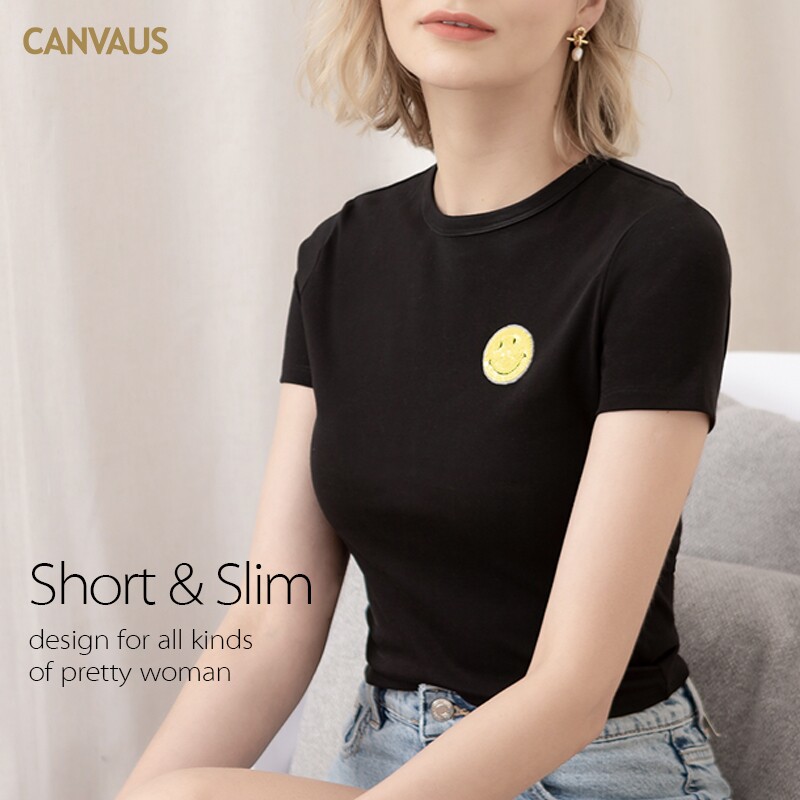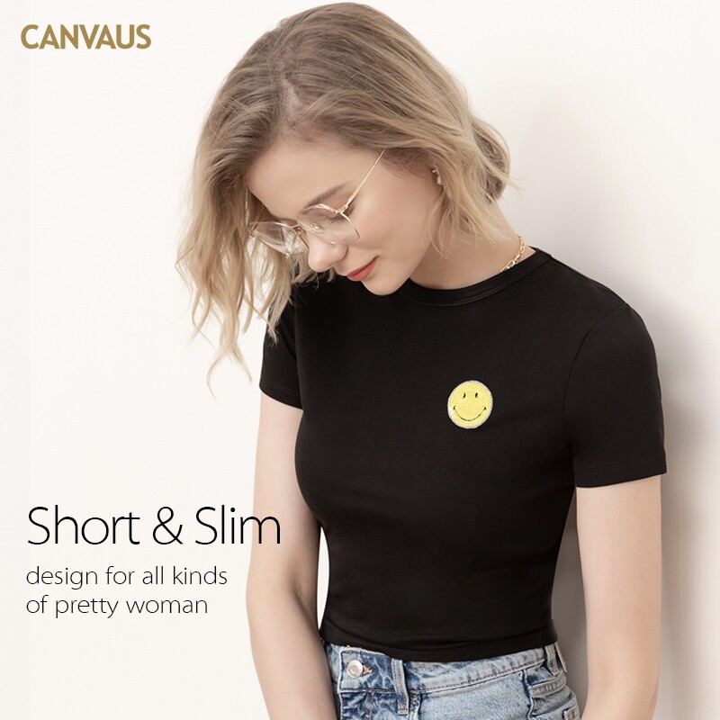 CANVAUS short sleeve t-shirt female threaded round neckline with smiley face printed blouse Chains short outside wearing body shirt