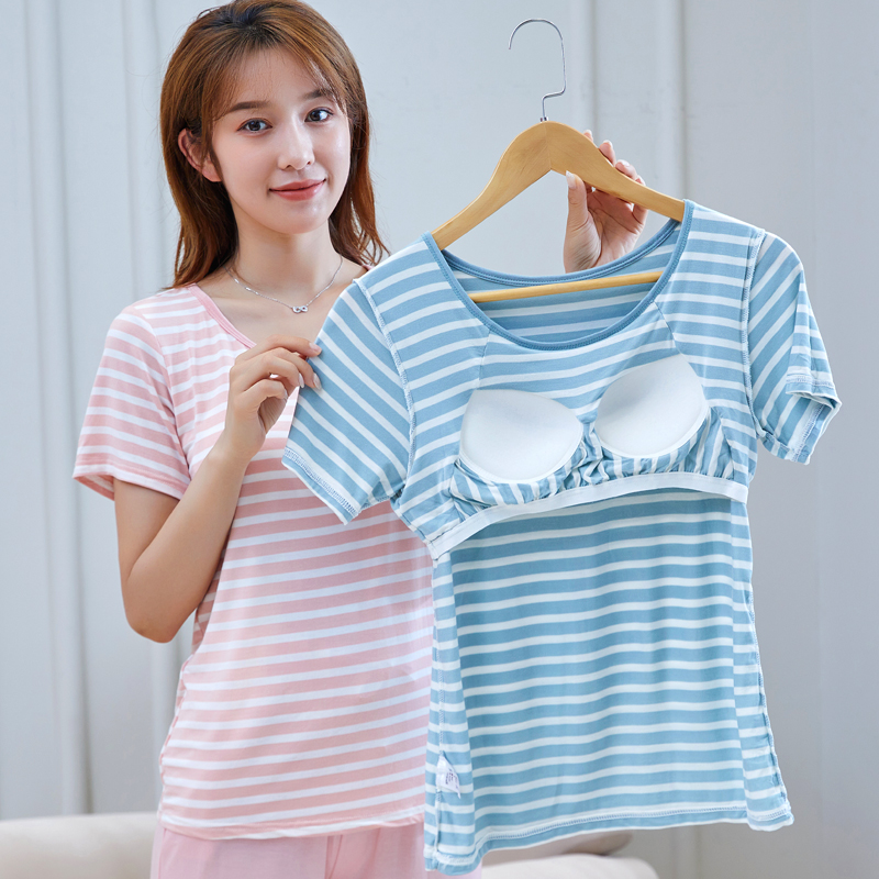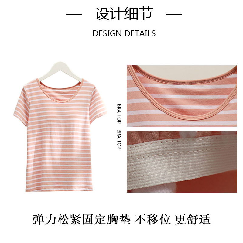 Short-sleeved T-shirt with chest pad Pajama top Women's summer bra-free cup one-piece base shirt Large size loose home wear