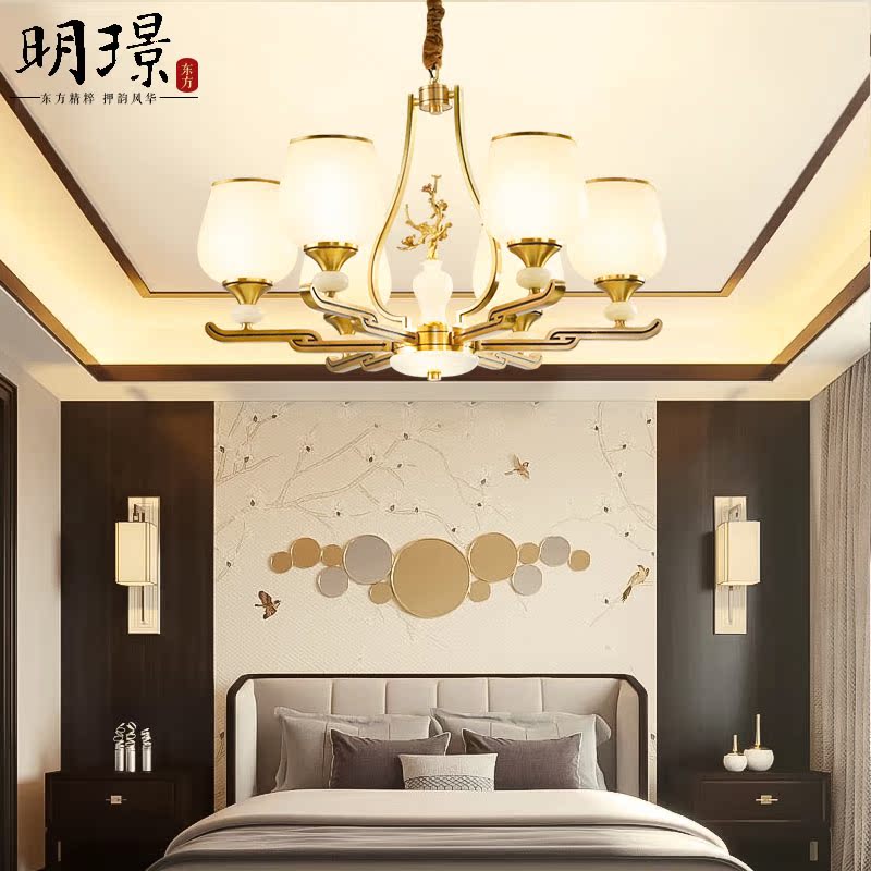 Total Copper Modern New Chinese Living Room Pendant Lamp Retro Atmospheric Bedroom Lamp China Wind Duplex Dining Room Jade Lamp