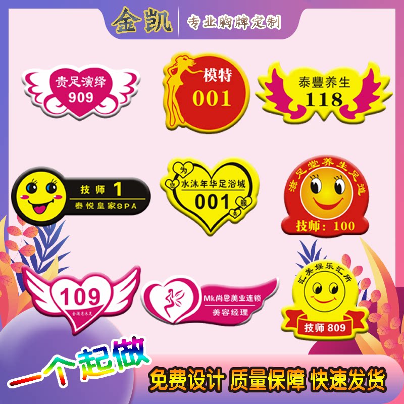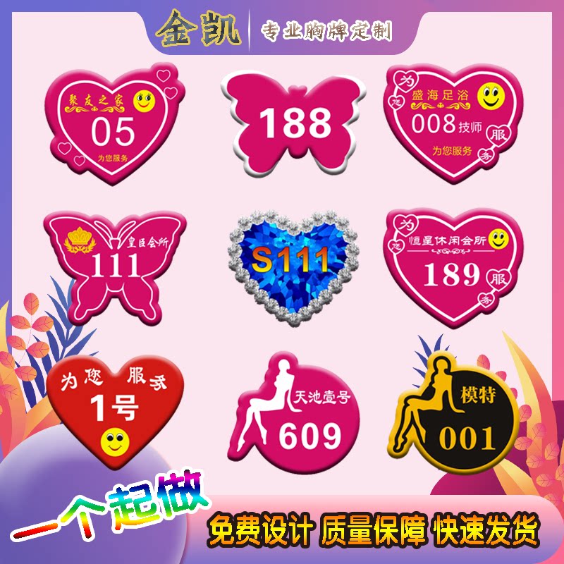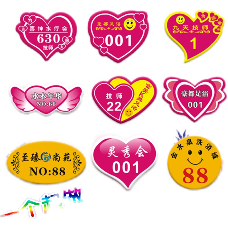Football Shop Massage Technician pin-chest brand round digital waist card heart-shaped KTV waiter brand custom smile