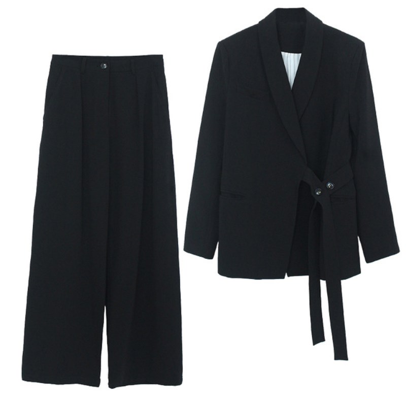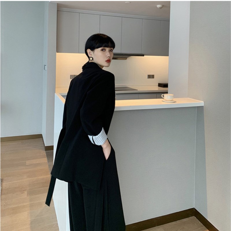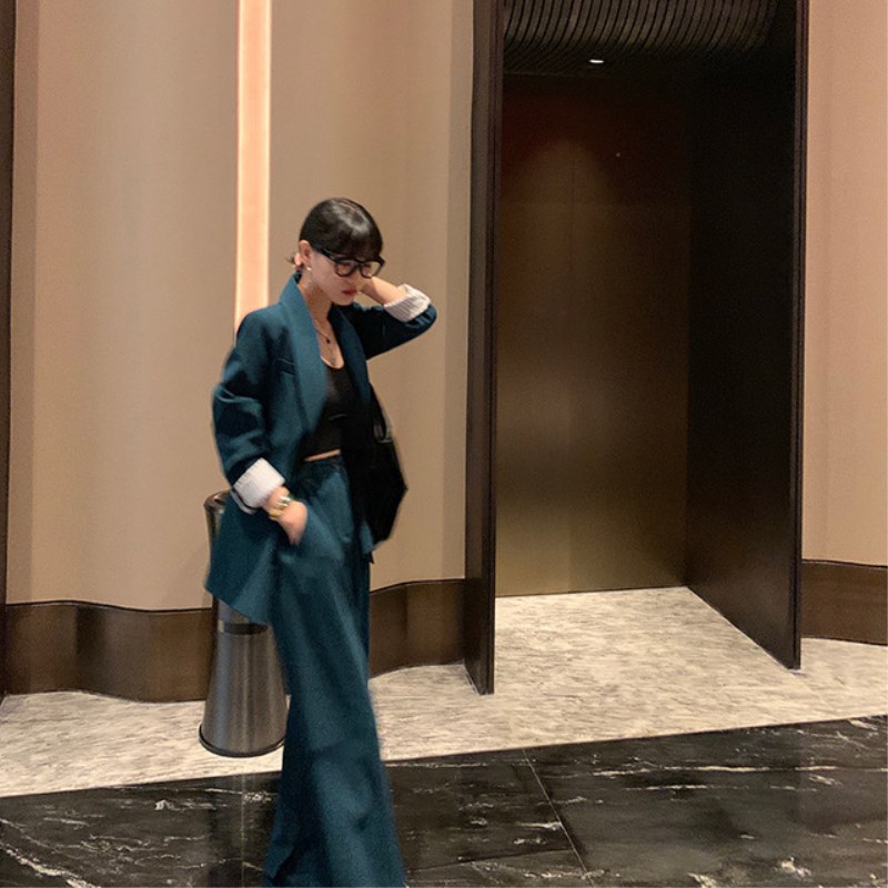 Spring and autumn suit women's big size suit Korean version in Korean version for long version Outer suit Fat mm temperament Western suit wide leg pants fattening 200 catty