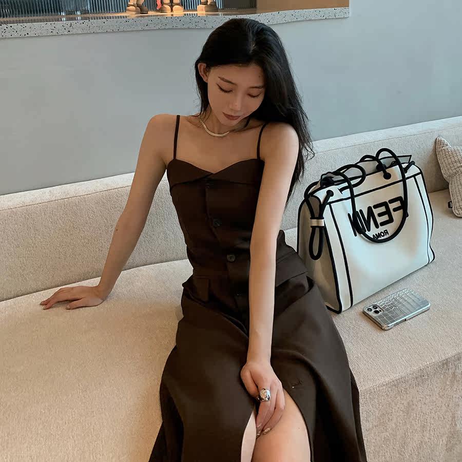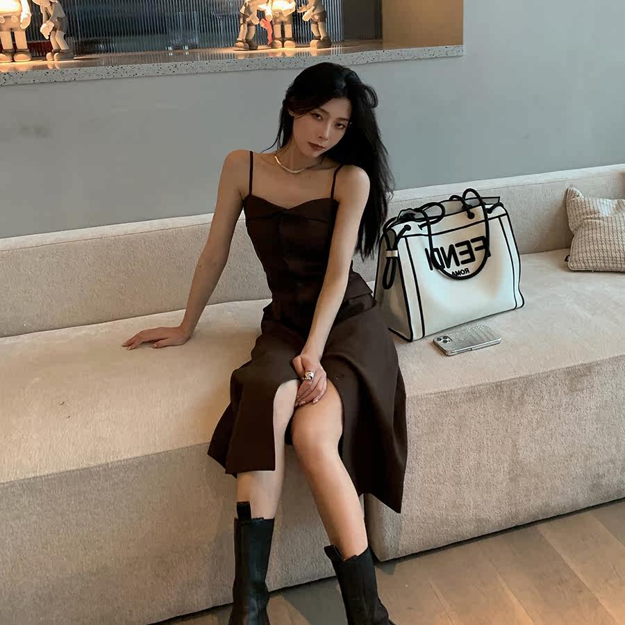 2022 New French long skirt high - sentiment repair retro skirt hanging sleeveless forklifted dress female summer
