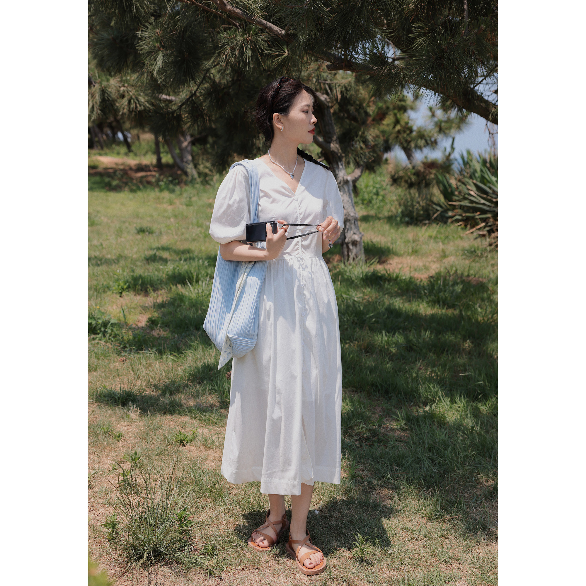 Ouyang Xi V bubble cuff pure orange pearl dress French elegant decrease age white forklift 2021 skirt