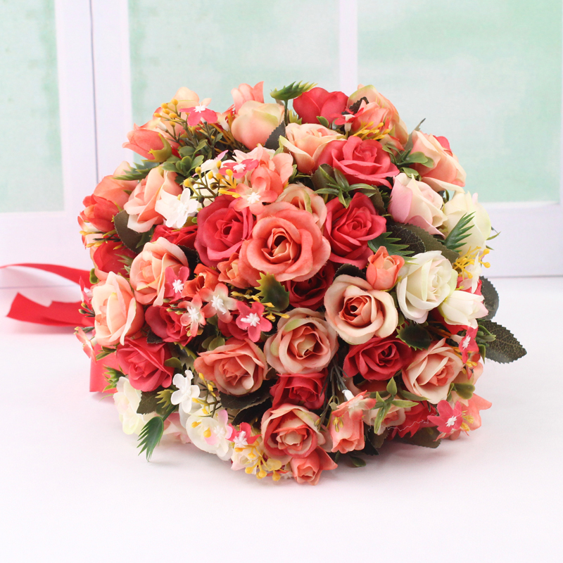 Wedding emulation hand held bridal wedding dress photo by hand to hold florist Han style champagne pink rose to take pictures and fake flowers