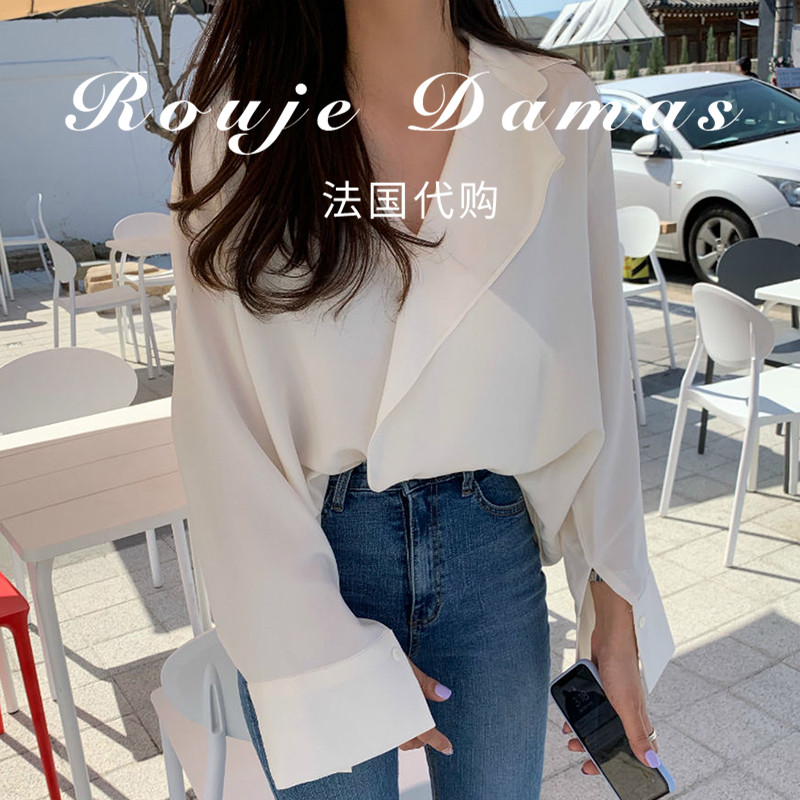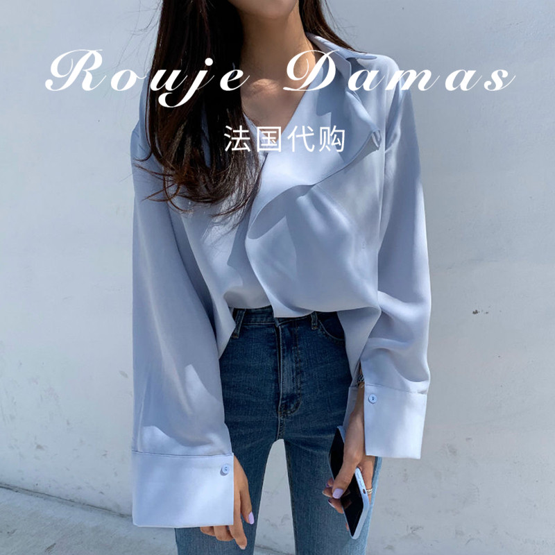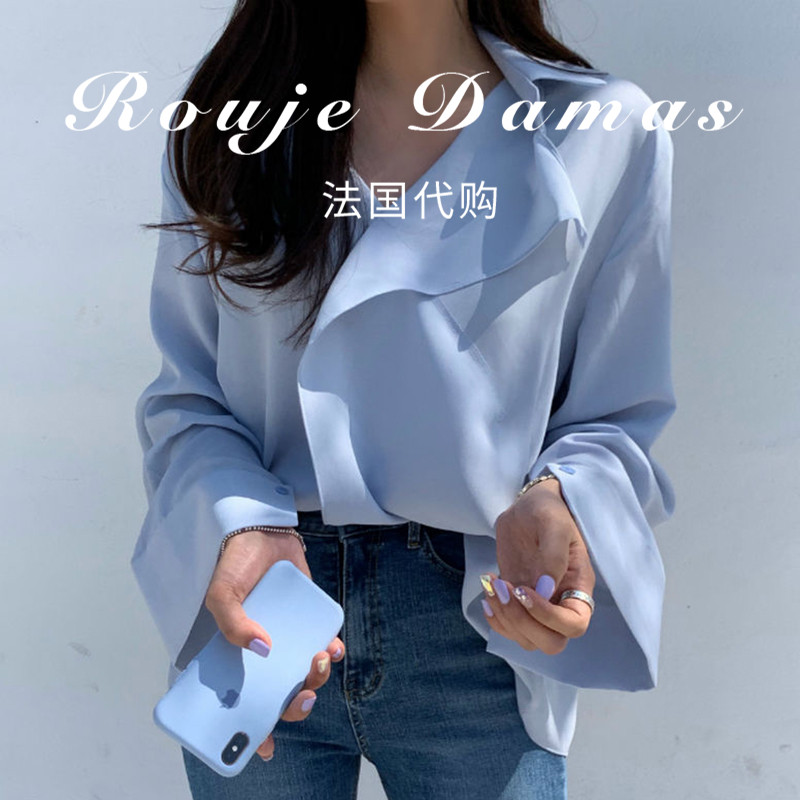 French rouje damas early autumn milk soft blue V collar cross design loose and long sleeve sun shirt