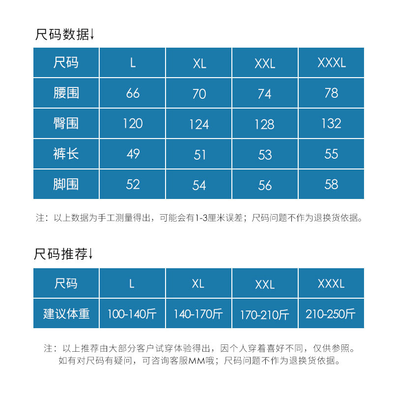 L (recommended for weight 100-140 catty) XL (recommended for weight 140-170 catty) XXL (recommended for weight 170-210 catty) XXXL (recommended for weight 210