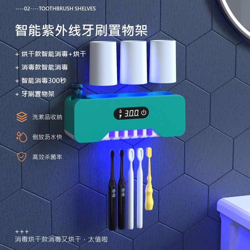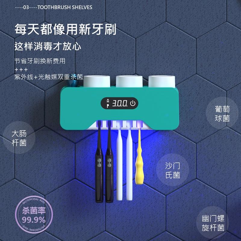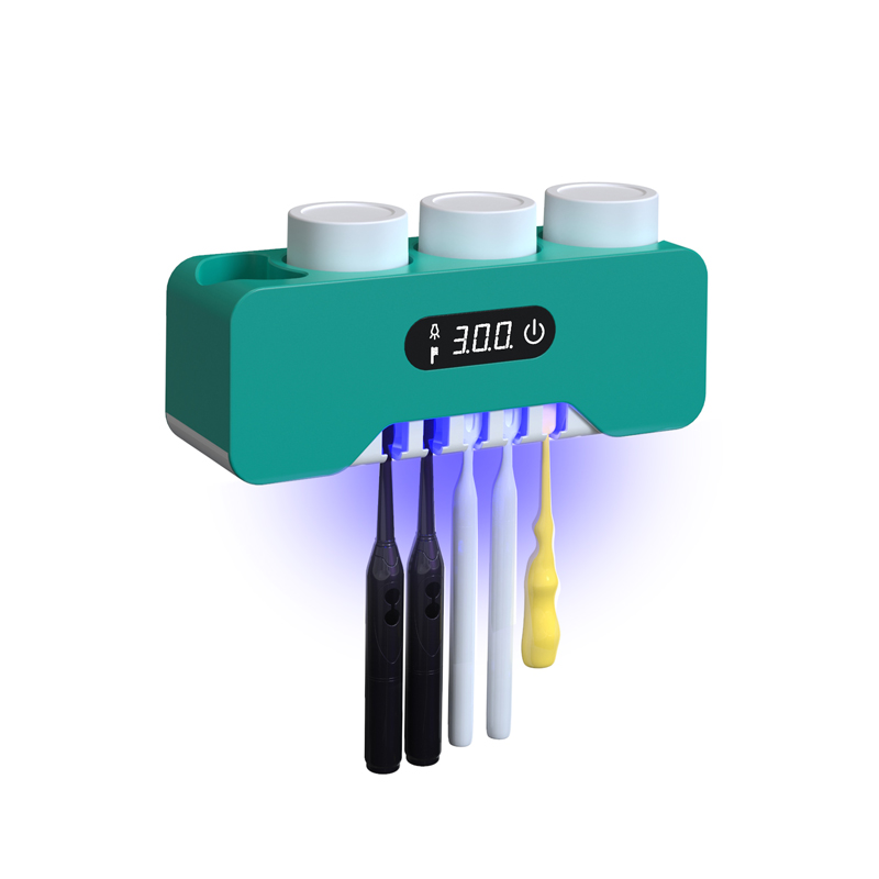 Three glasses of UV disinfection charging (peacock green) Three glasses of ultraviolet disinfection charging with a toothpaste squeeze (peacock green) Four glasses of UV disinfection charging (peacock green) Four glasses of ultraviolet light in the