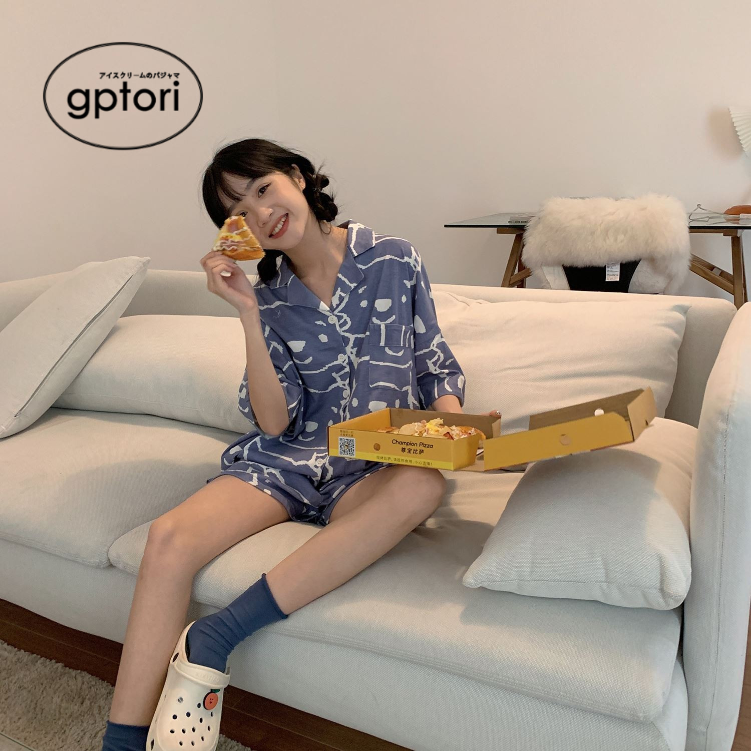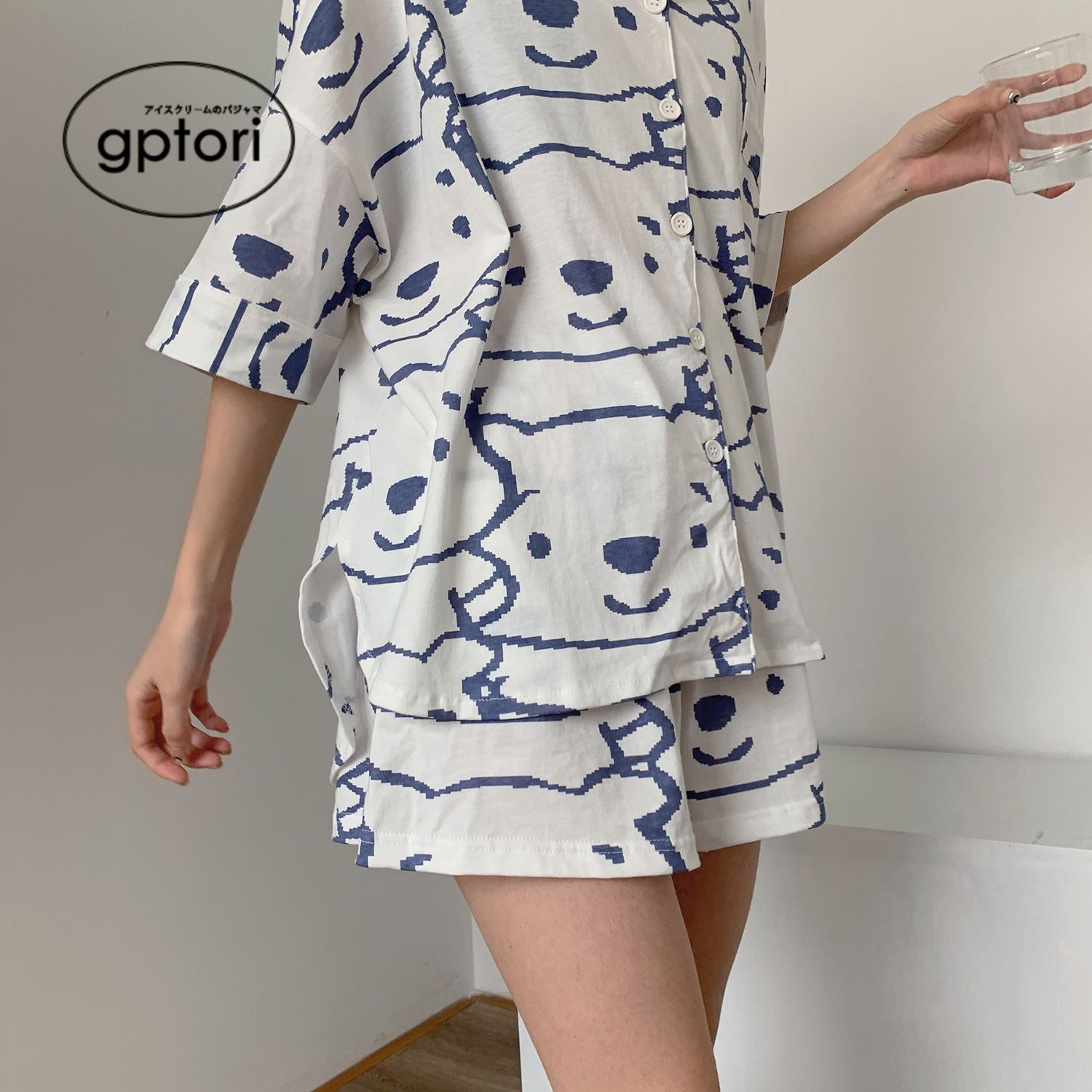 Japanese pajamas women's summer new style can be worn outside cute simple pen bear loose short-sleeved cardigan shorts home service