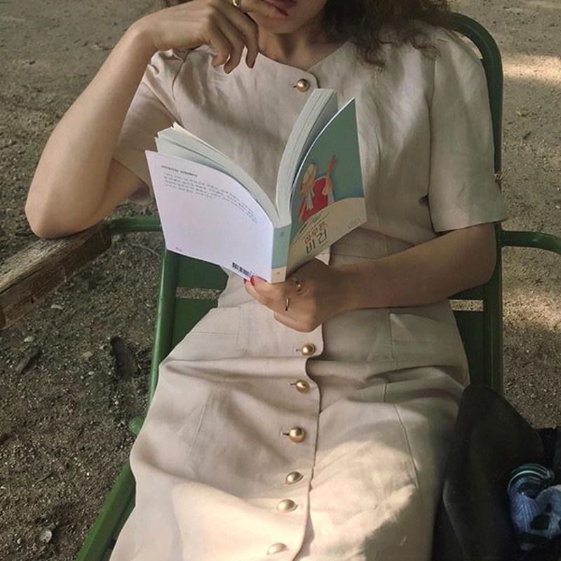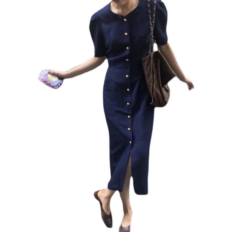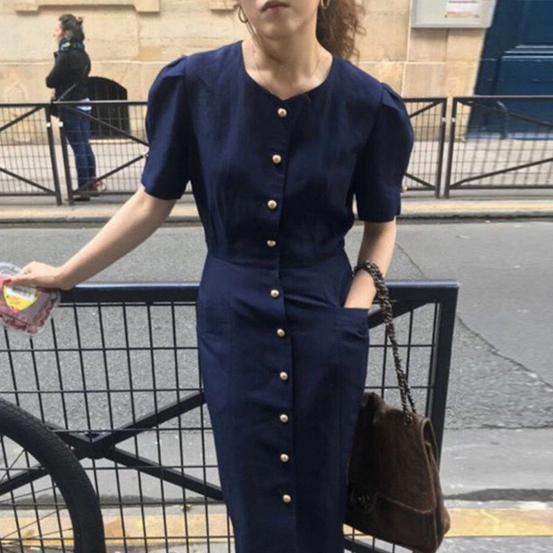 Hepburn style dress 2021 summer new thin waist temperament French retro navy blue cotton linen tea break skirt