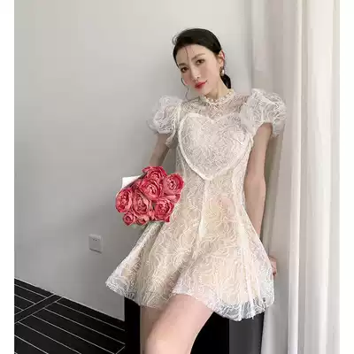 First love coffee break French bubble sleeves gentle retro lace dress female spring and summer design sense Niche small man