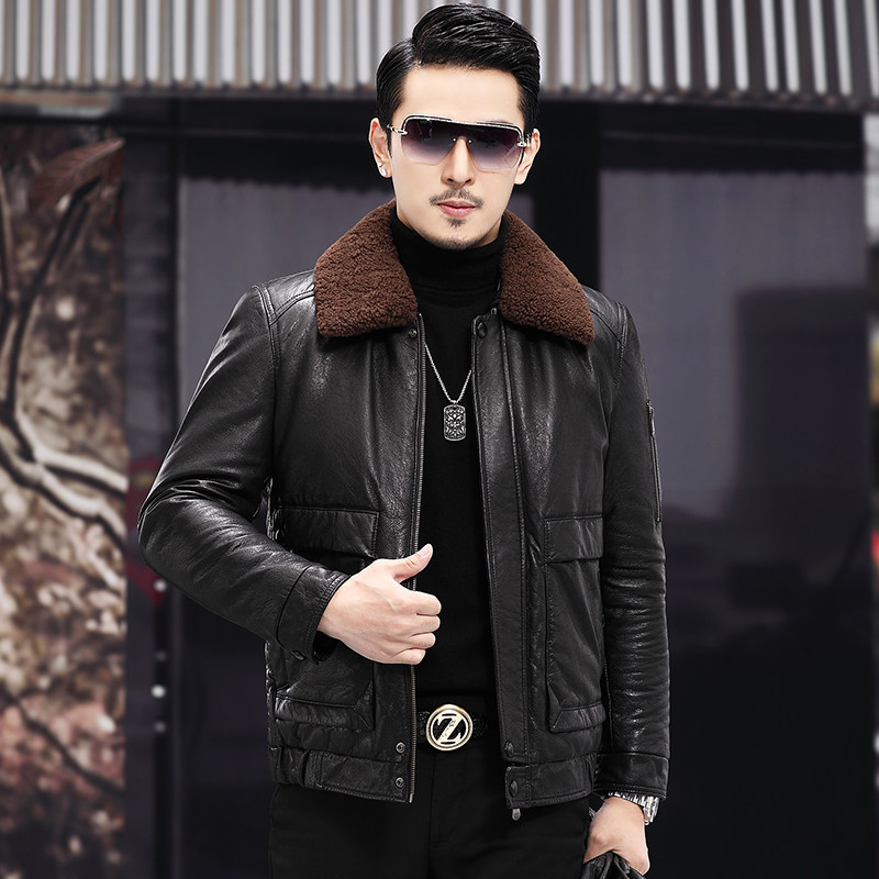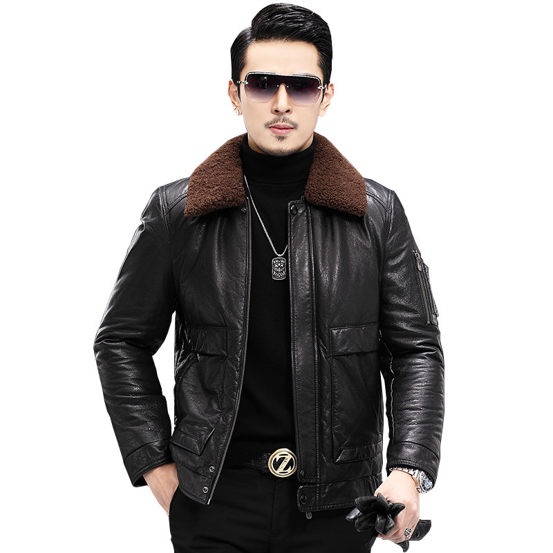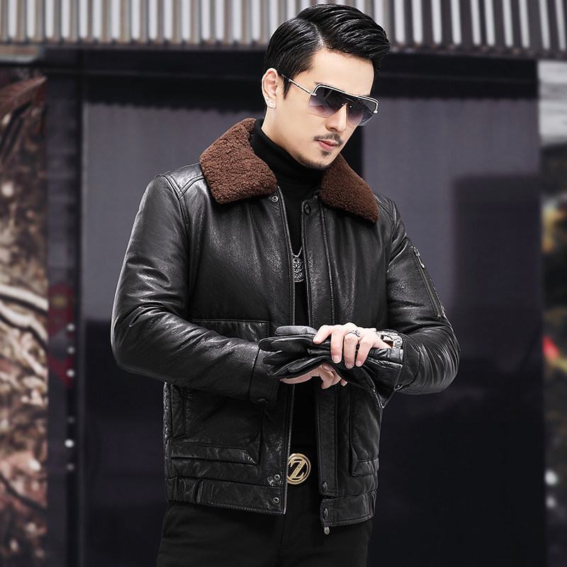 Genuine leather down jacket men's short top layer cowhide winter large size thickened lamb fur collar Haining leather jacket jacket