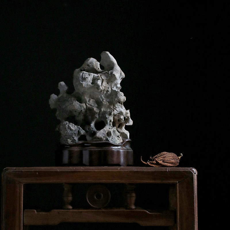 Quiet and late cage Cute clear for tea space clubhouse case head Masite natural Taihu stone connoisseurywork black sandalwood base
