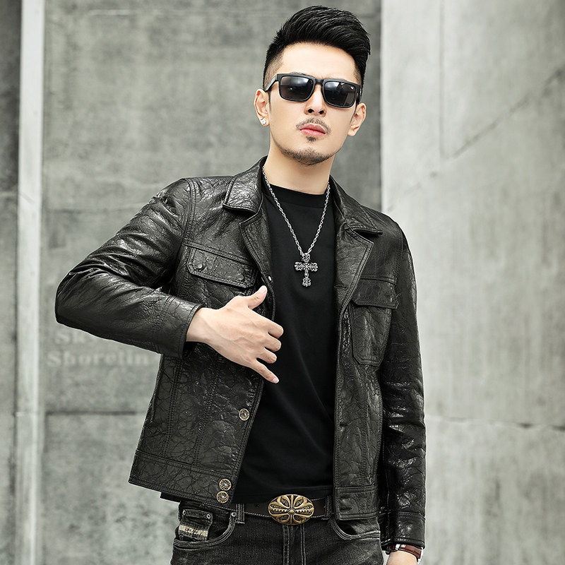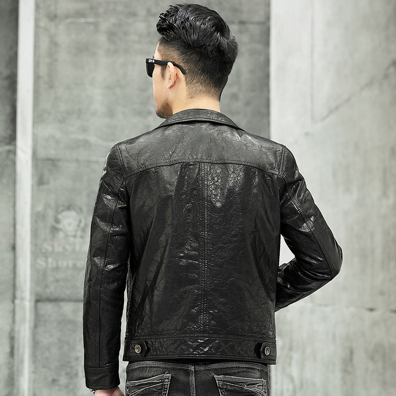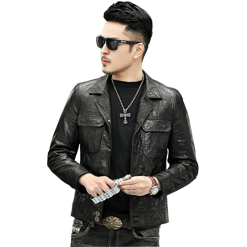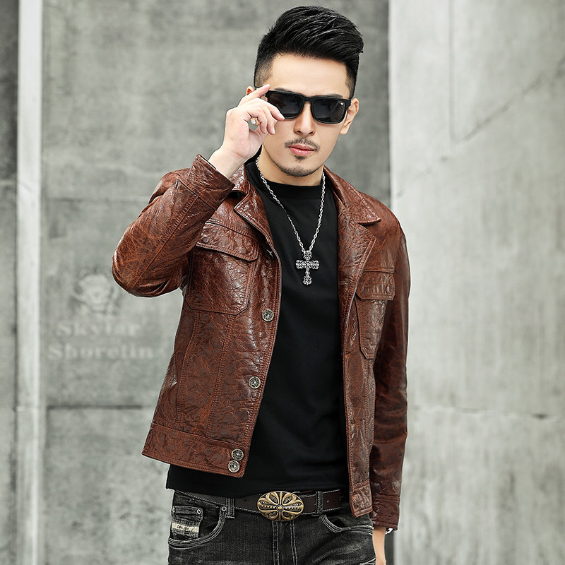 Leather leather men short vintage oil wax calfskin leather suit collar pocket button fashion jacket locomotive jacket jacket