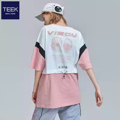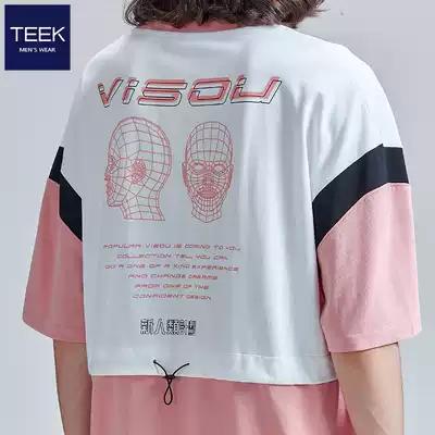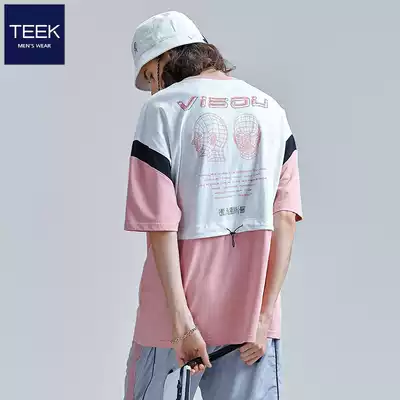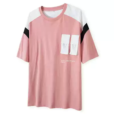 (National tide new product buy 1 get 1 free)Contrast stitching pure cotton t-shirt men's 2021 summer pocket 5-point couple top
