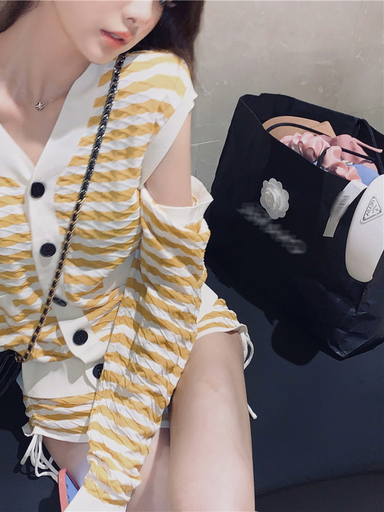 Summer Hong Kong style retro chic casual fashion Western style age-reducing black and white striped shirt shorts two-piece suit female trend