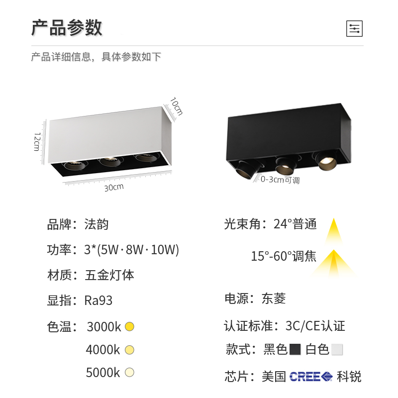 All black-3*10W-neutral light 4000K focus (all black)-3*10W-warm light 3000K focus (black and white)-3*8W-neutral light 4000K