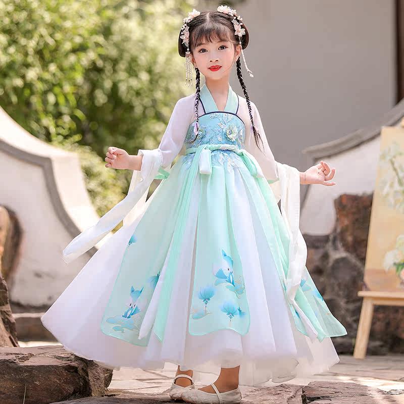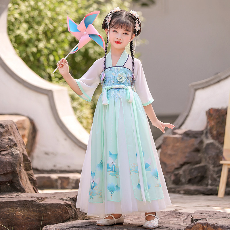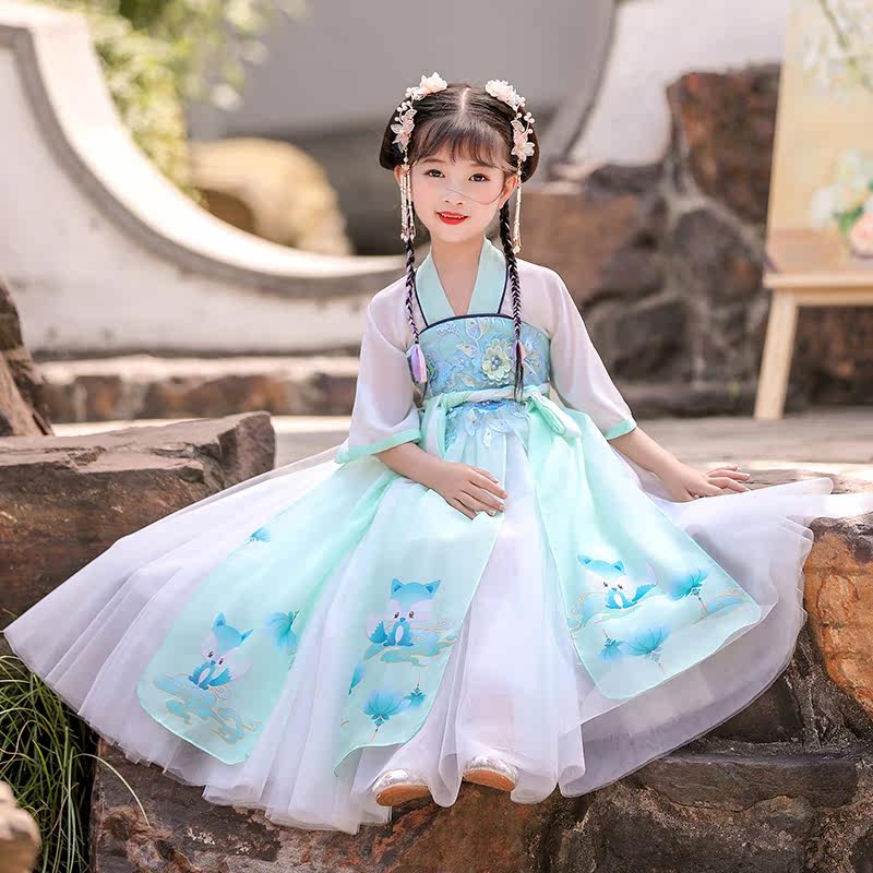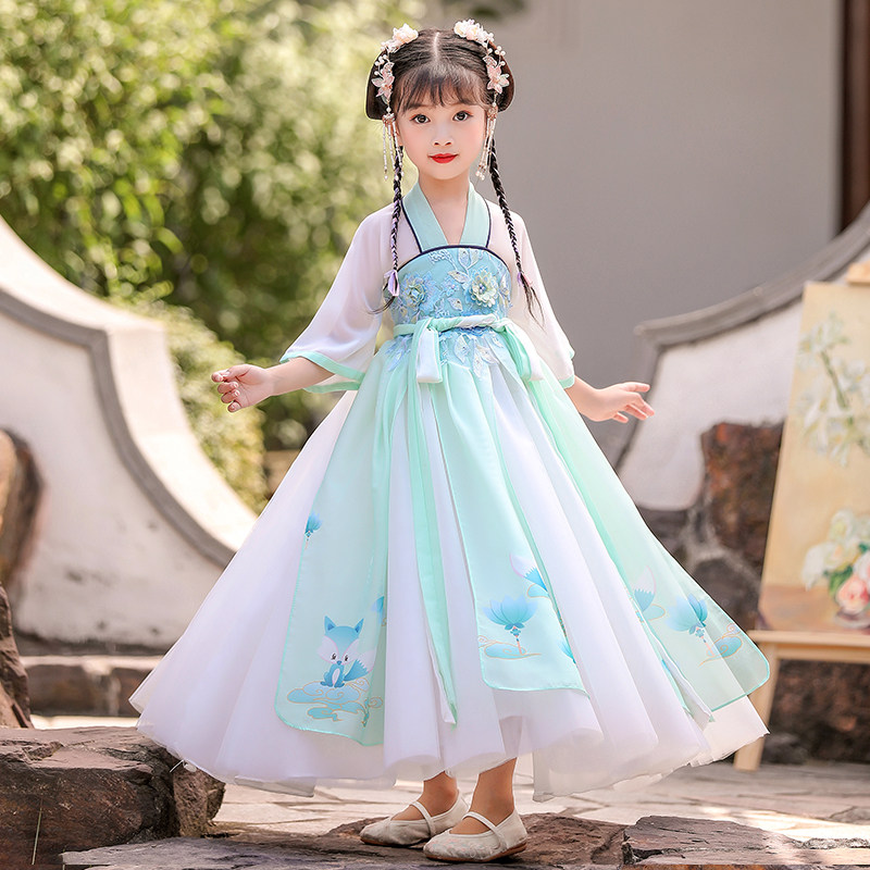 Han dress girl summer thin fairy chip short sleeves Chinese wind summer dress white super fairy children antique