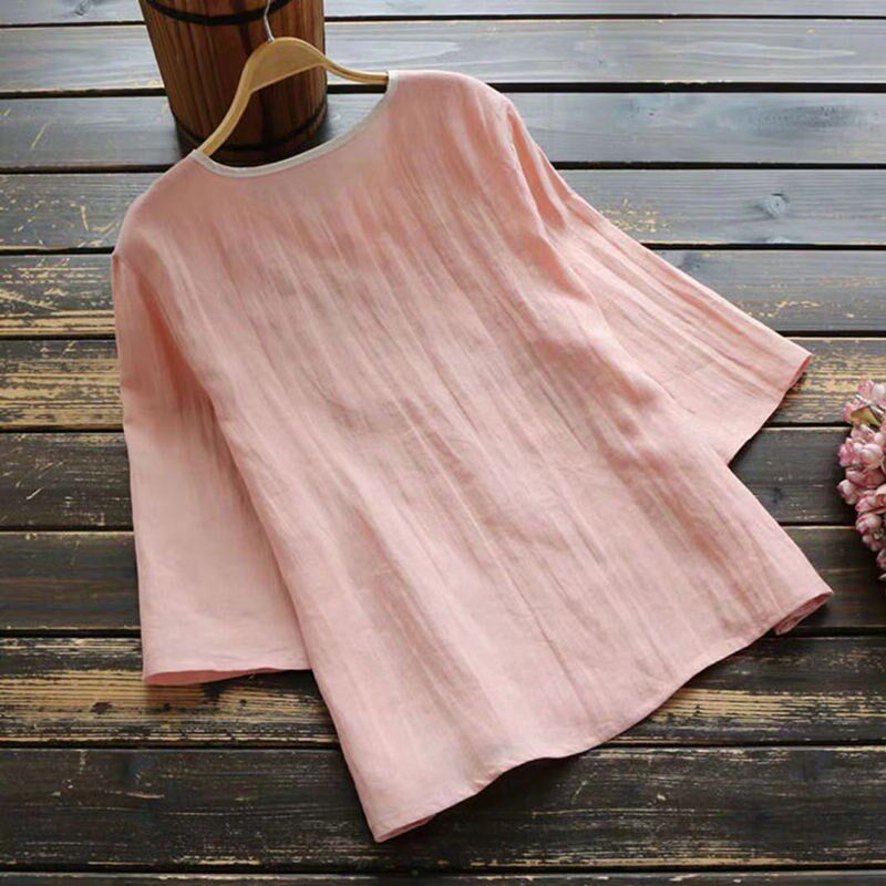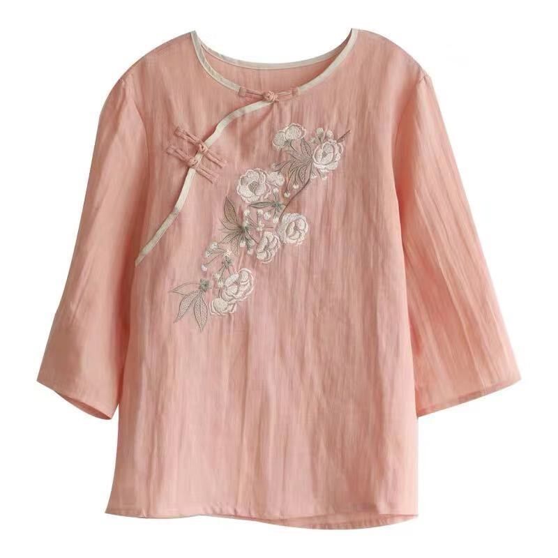 Pure cotton 2021 summer new literary retro ethnic style loose slanted lapel Chinese style buttoned three-quarter sleeve women's T-shirt - Taobao