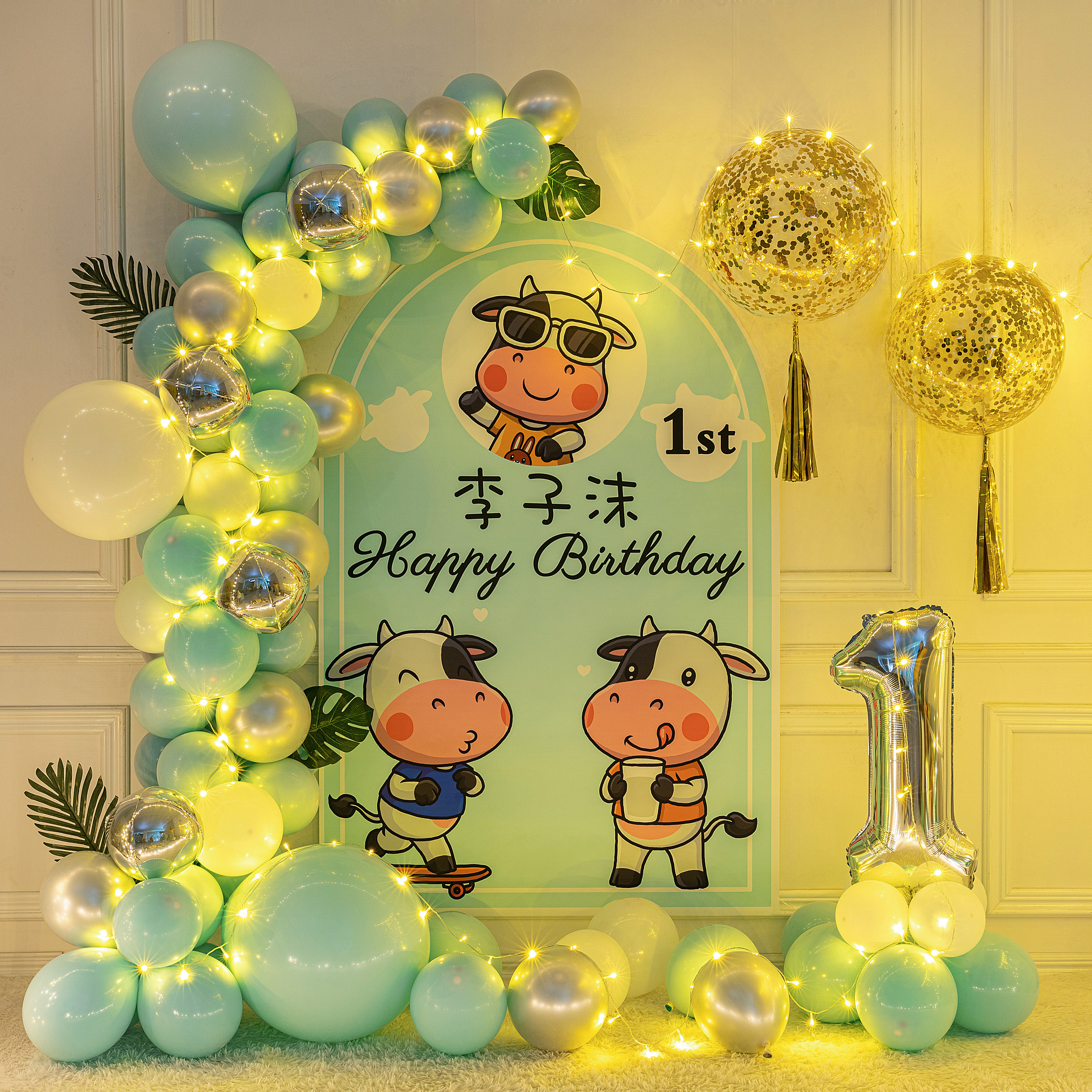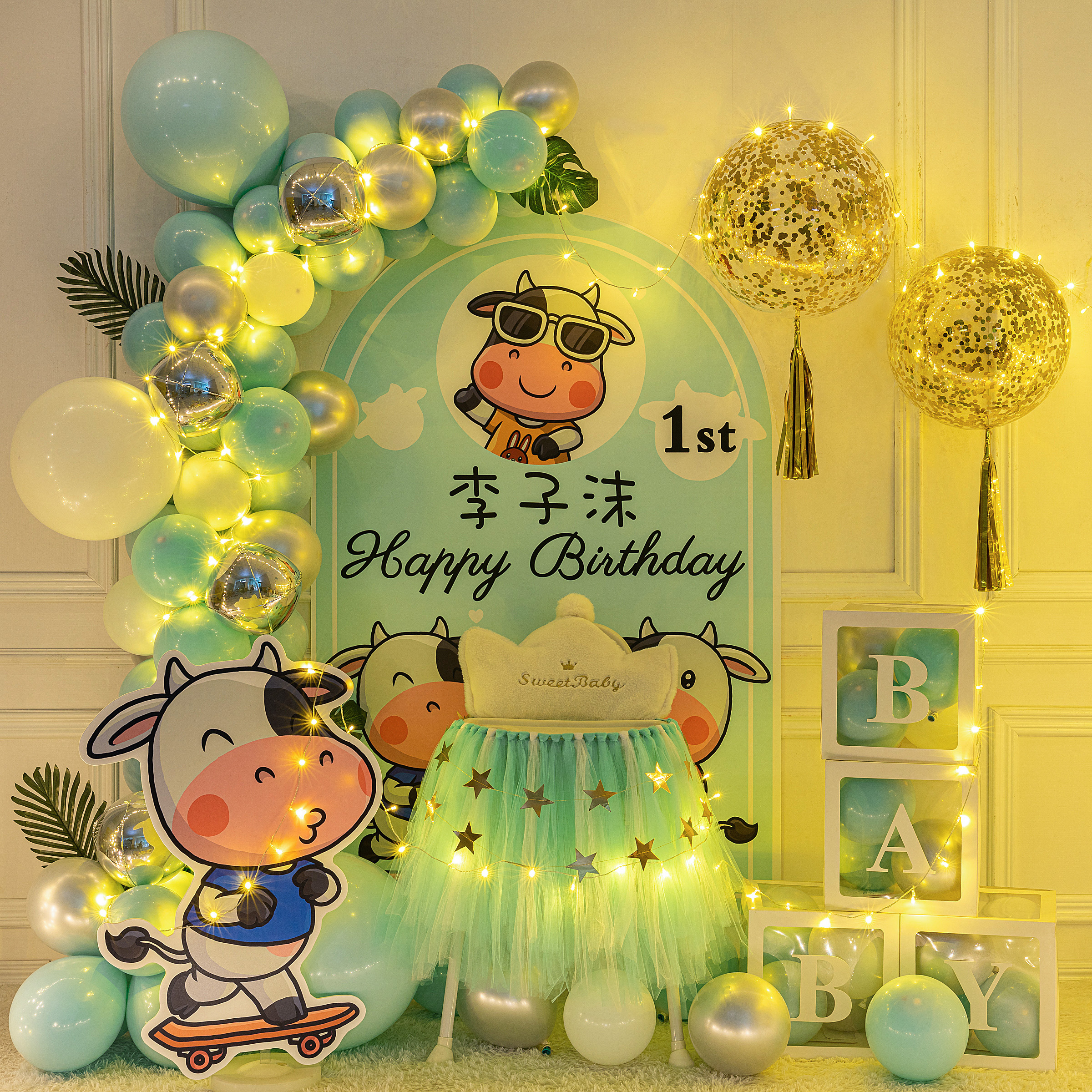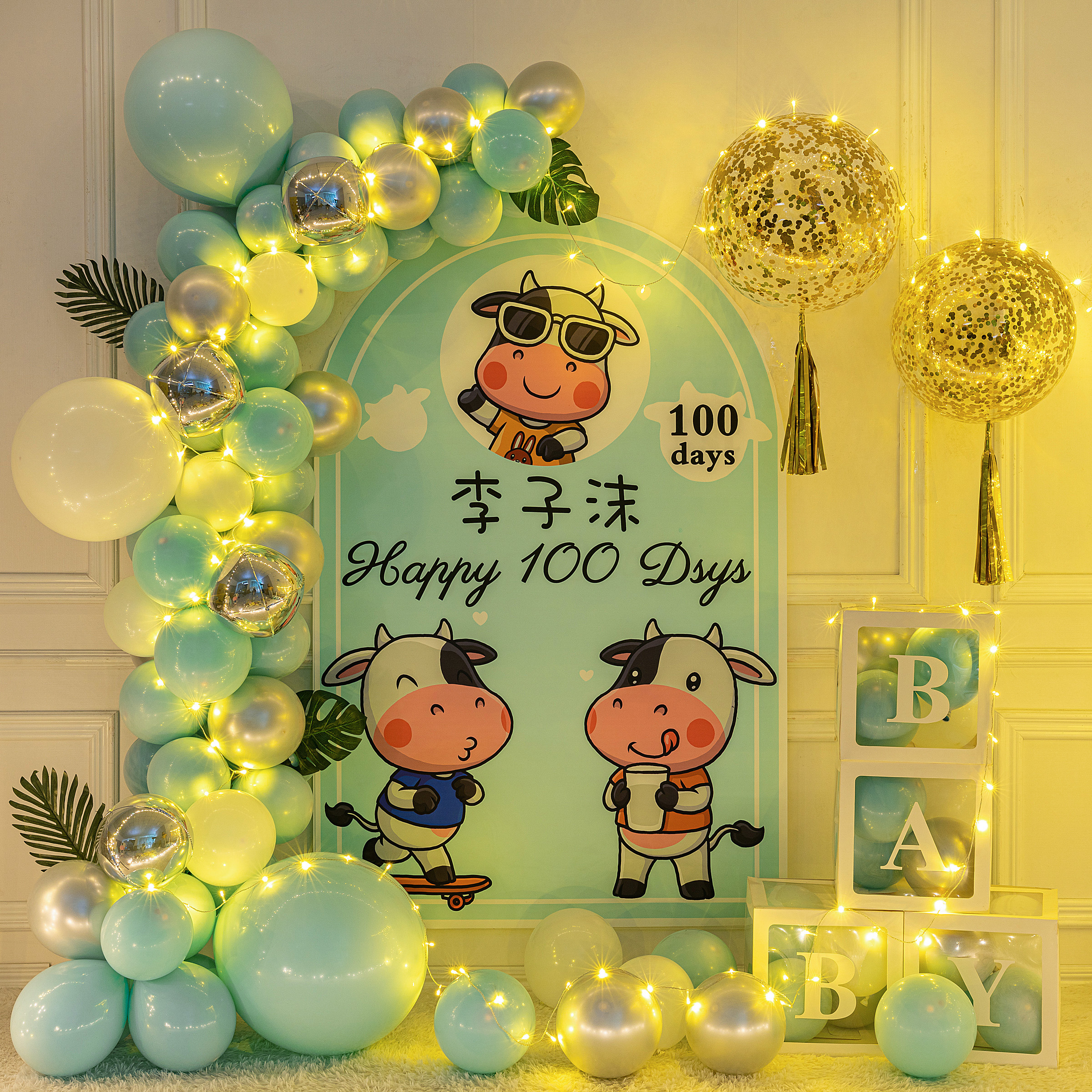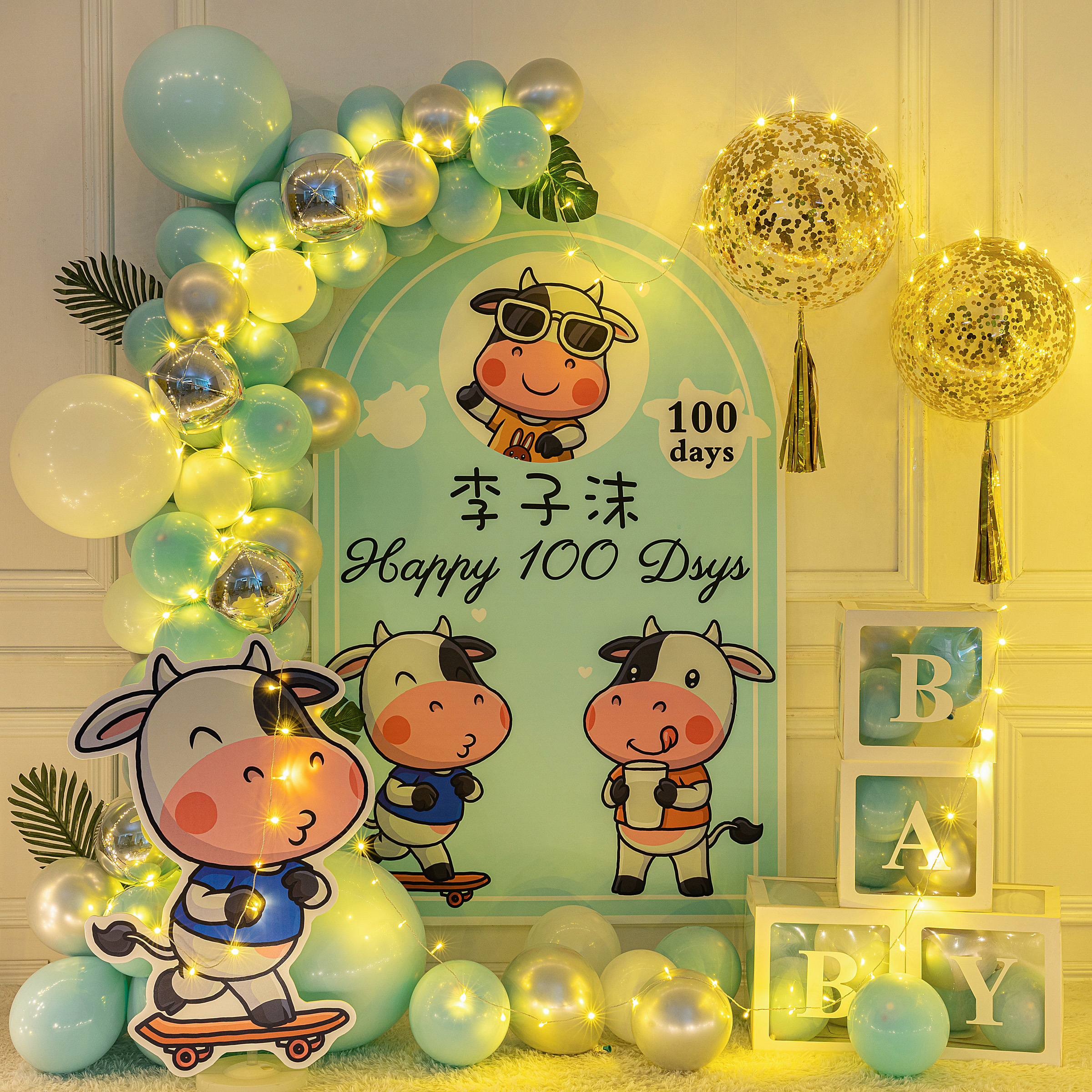 Cow baby boy girl full moon hundred days feast decoration first birthday birthday layout poster custom background wall balloon