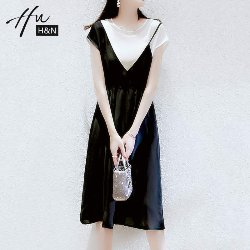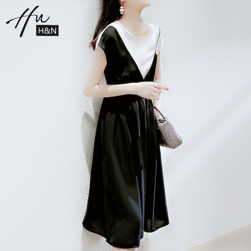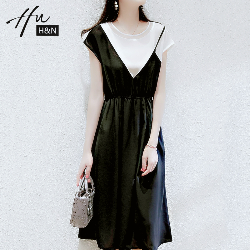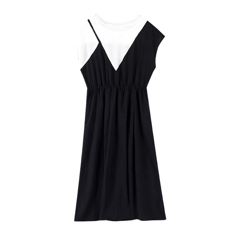 Fan-style high-end fake two-piece design feeling small crowdsummer new closeted waist display slim commute temperament little black dress