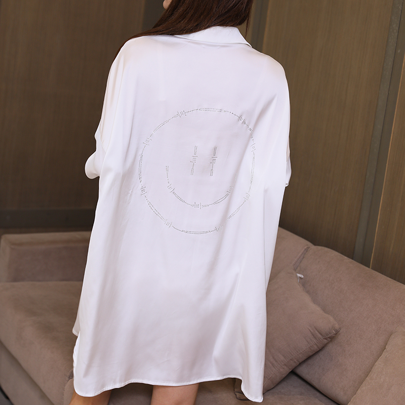 New pajamas, round face, hot drill, sexy polo collar, ice silk nightdress, can be worn as a shirt, medium and long version of silk homewear