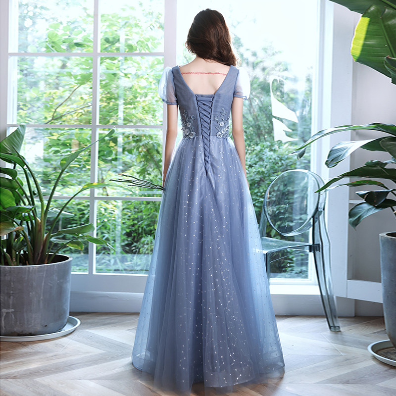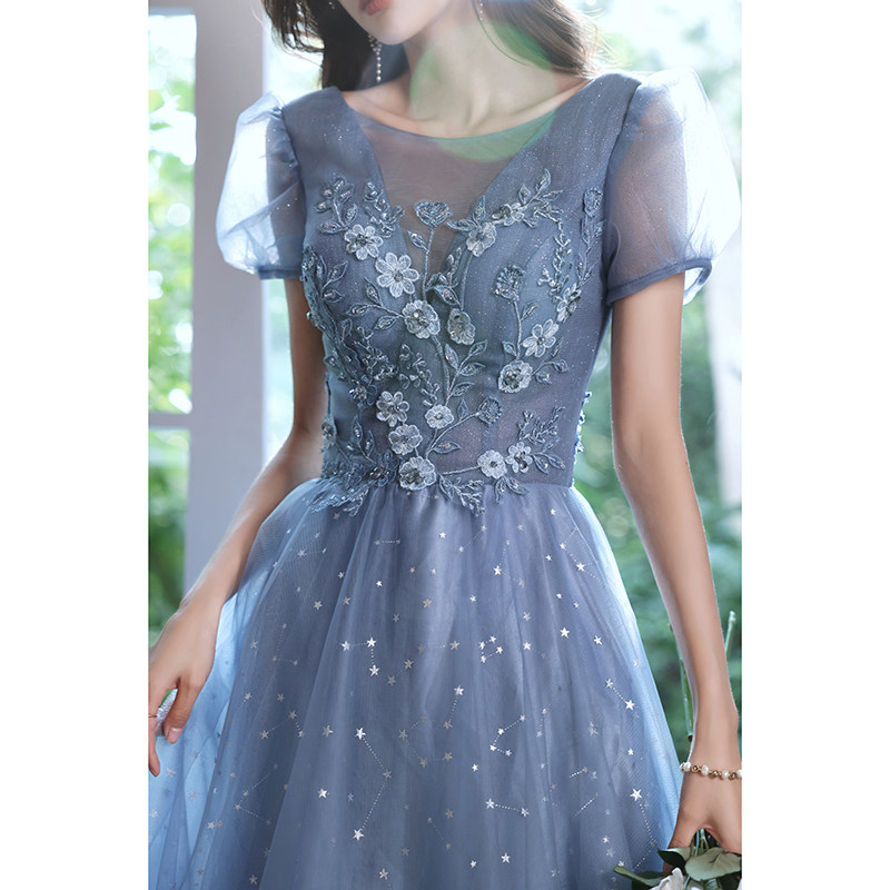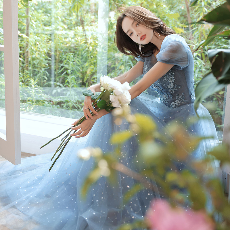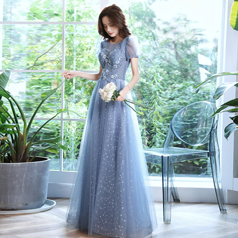 Blue evening dress 2022 new banquet temperament fairy long version host senior art examination vocal dress skirt female