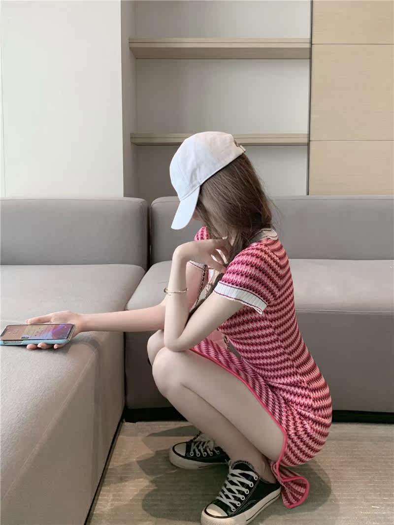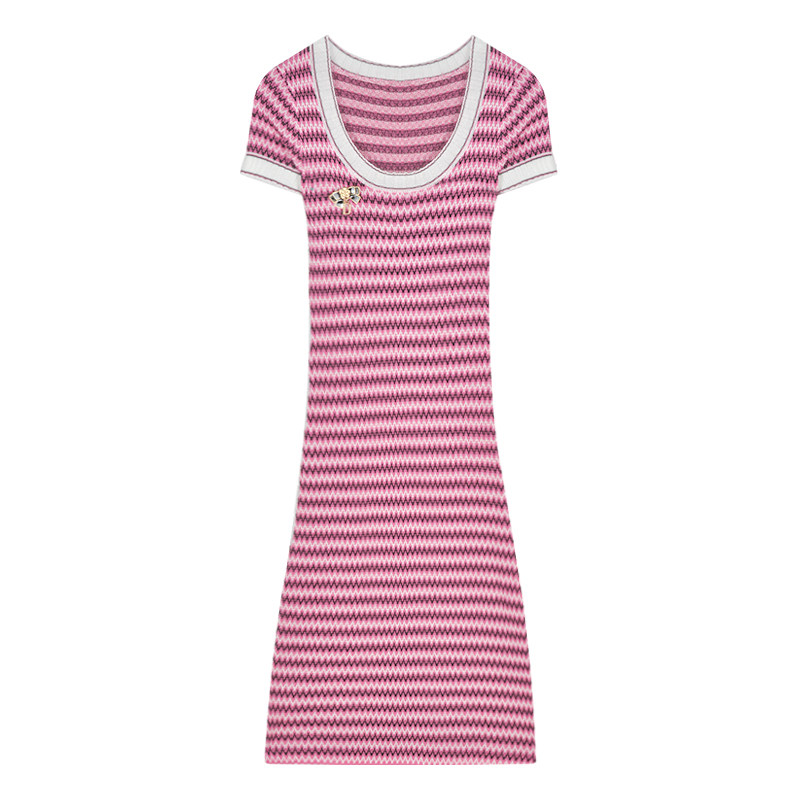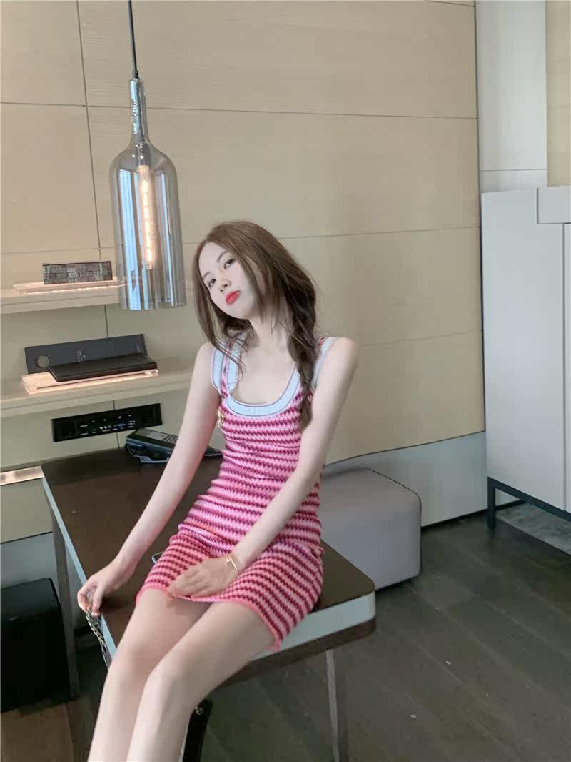 Summer French niche temperament knitted fried street striped dress split pink salt series slim hip skirt women