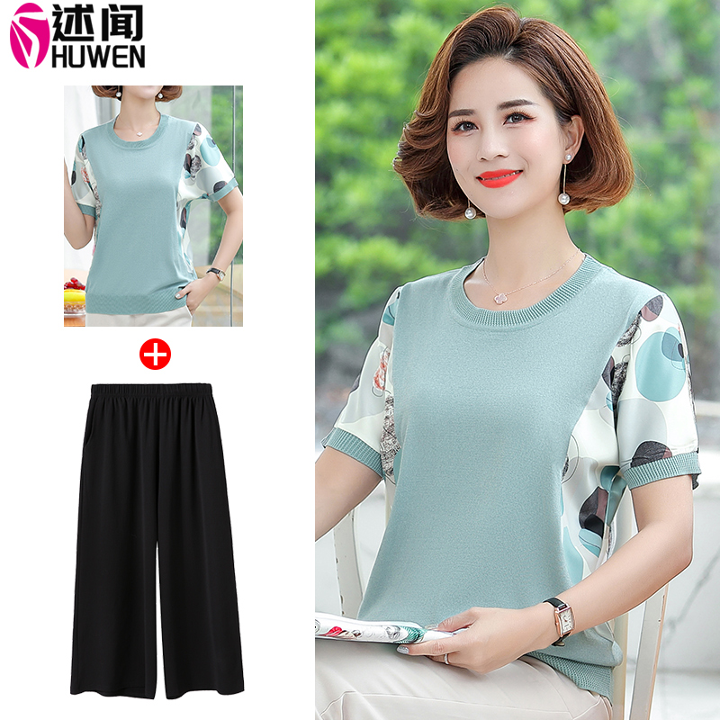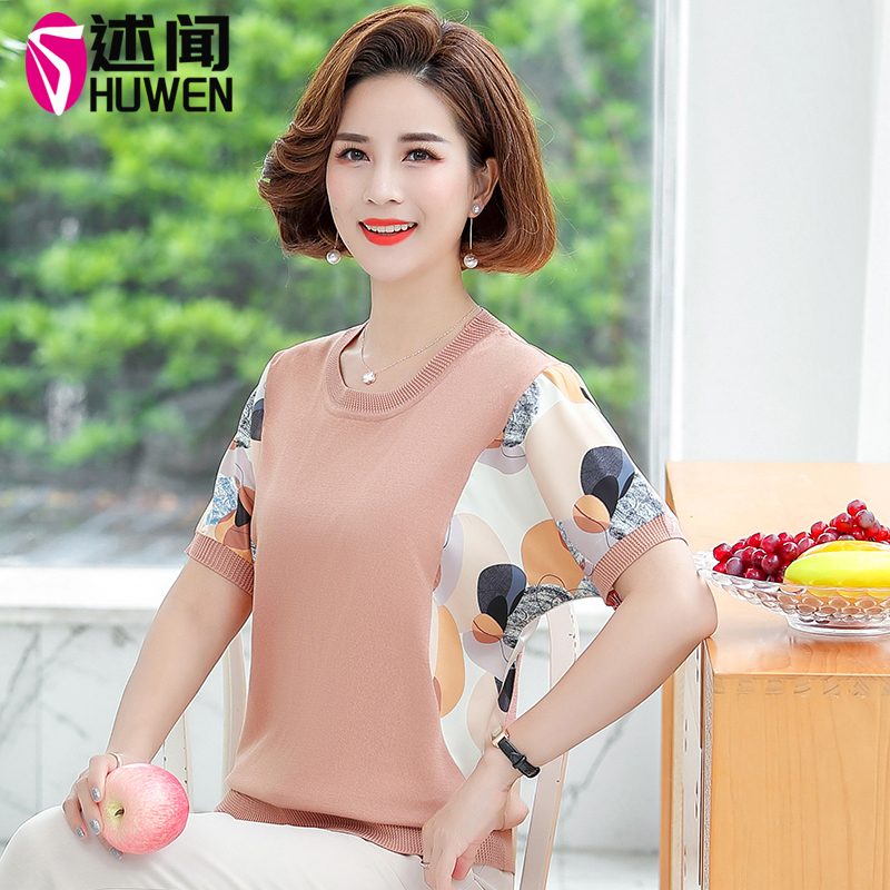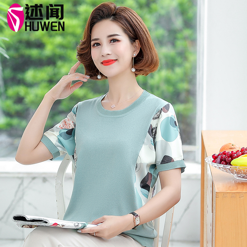 Young mom summer loaded short sleeve T-shirt for older women ice silk blouses 50-year-old middle-aged woman summer suit