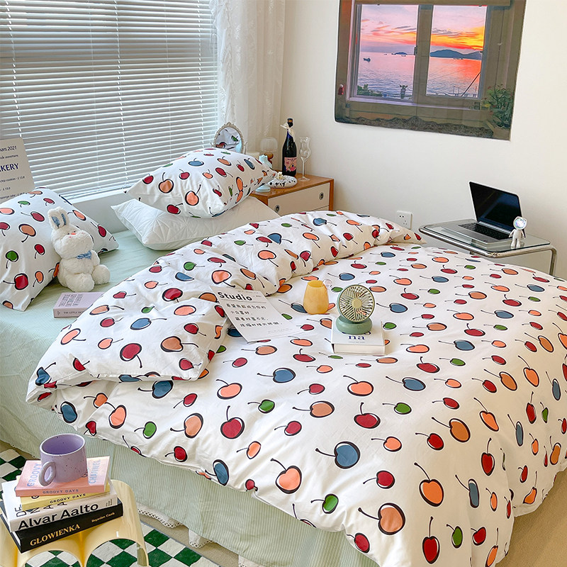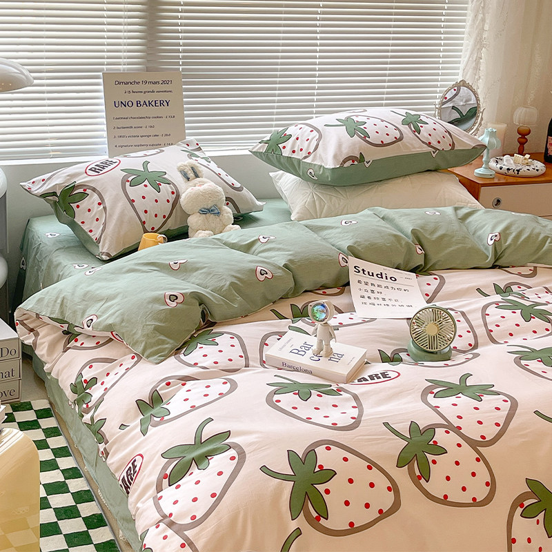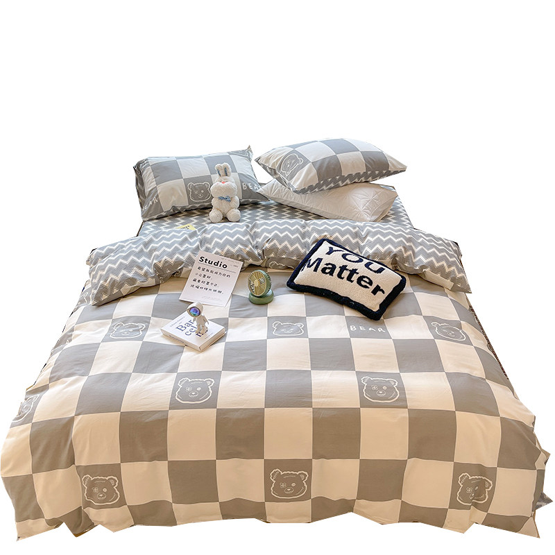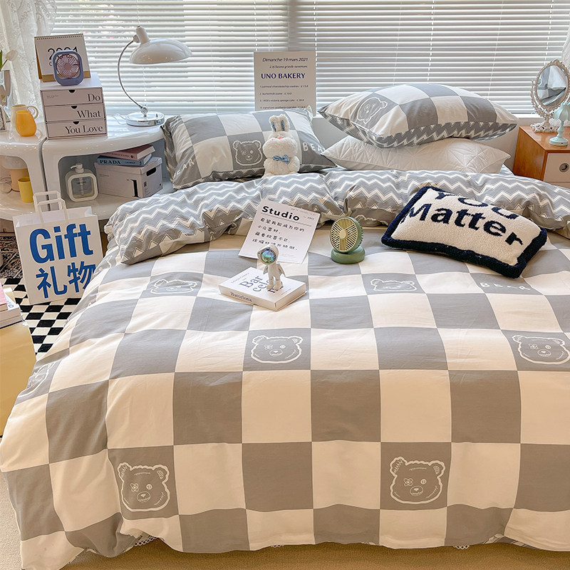 Han Department Brief Grey Plaid Bear Pure Cotton Four Pieces Cute Cartoon Ins students 3 sets of small frescoed bedding