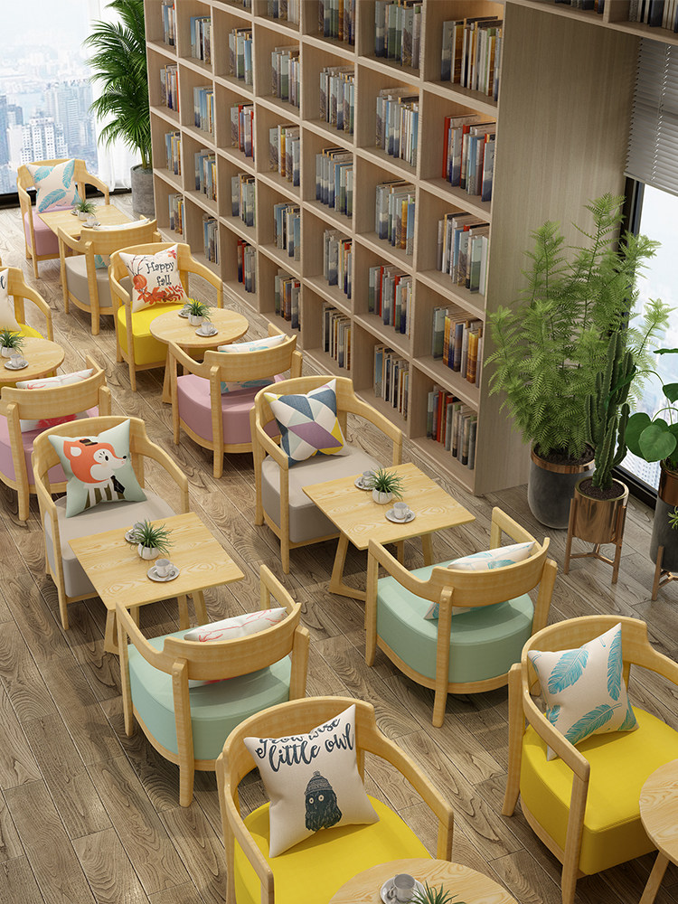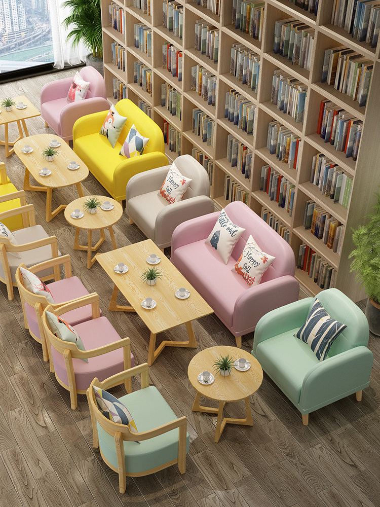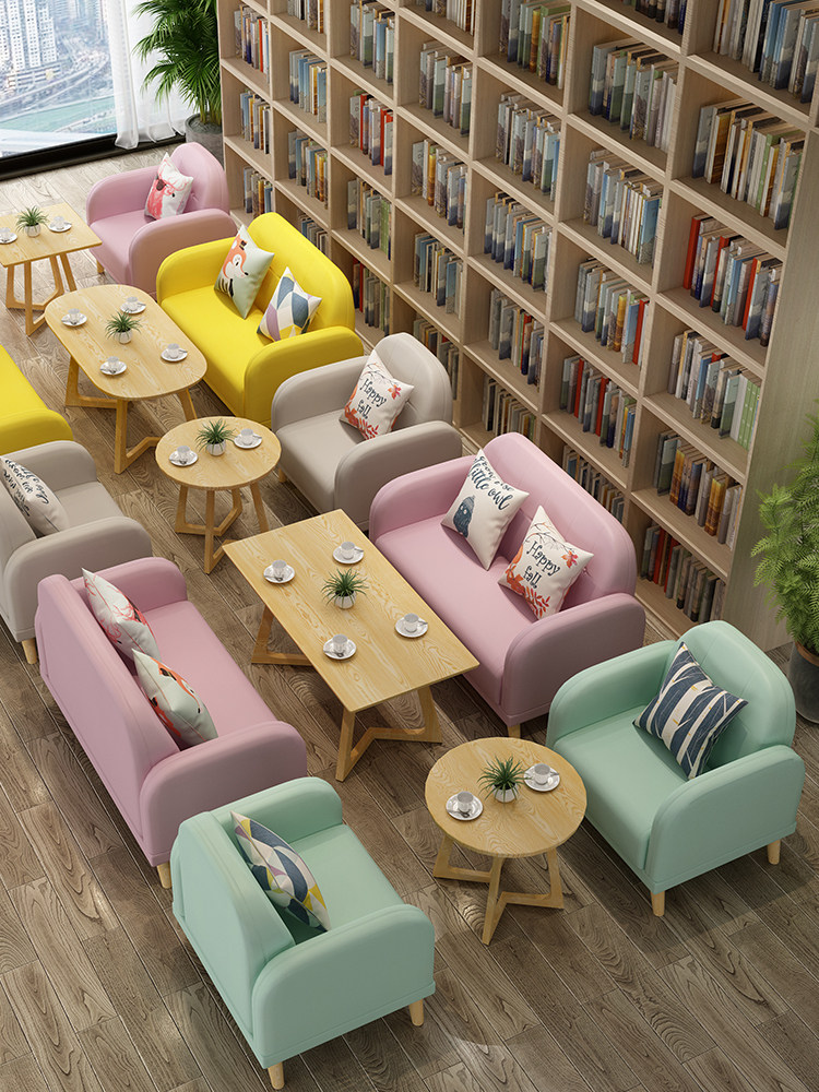 Customized leisure sofa wooden dining furniture dairy tea shop tables and chairs cafe sales office negotiate bookbar reception group