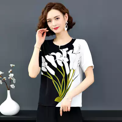 Heavy silk coat female middle-aged mother summer mulberry silk short sleeve T-shirt middle-aged women's loose fragrant cloud yarn t