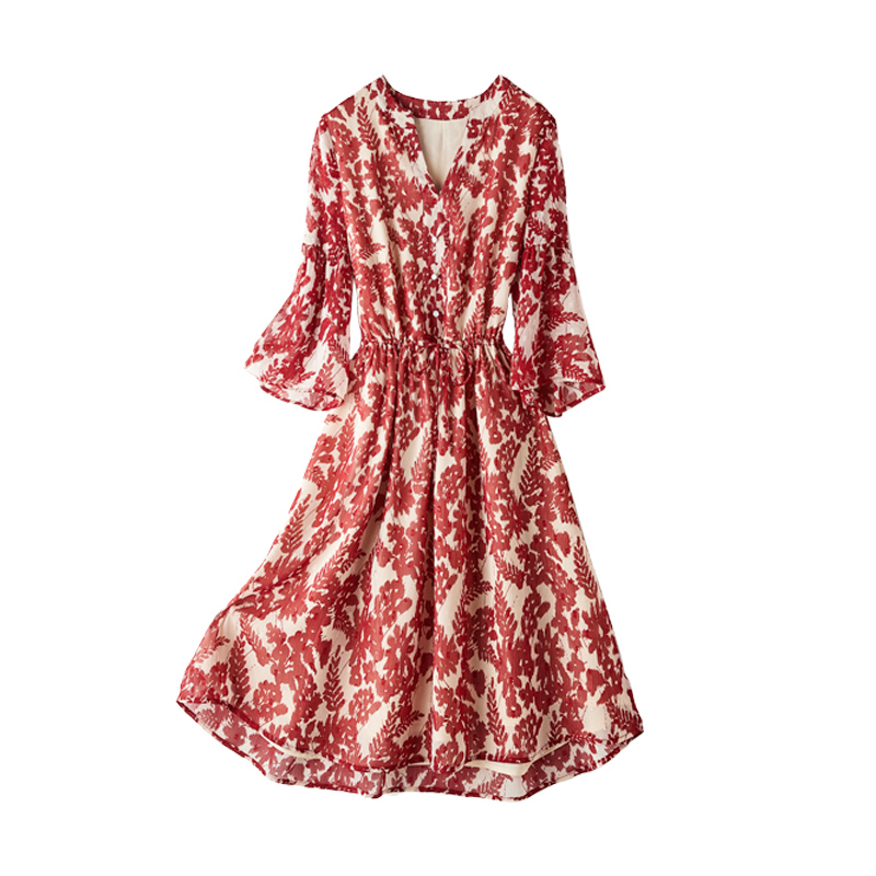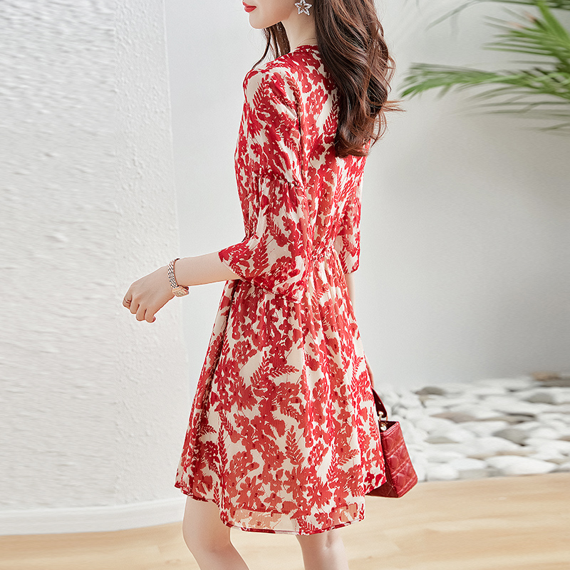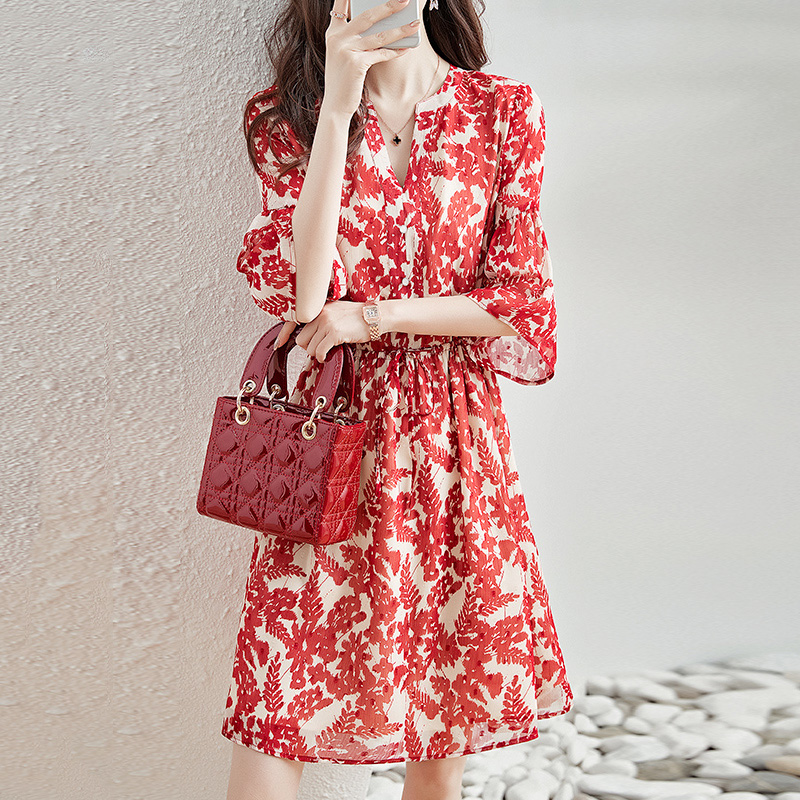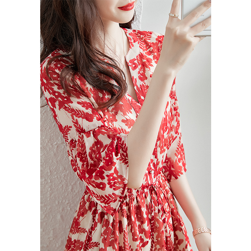 iFashion light and luxurious women's clothing High-end Red Printed Ocean Dress Summer Lacing small Temperament Shatt dresses