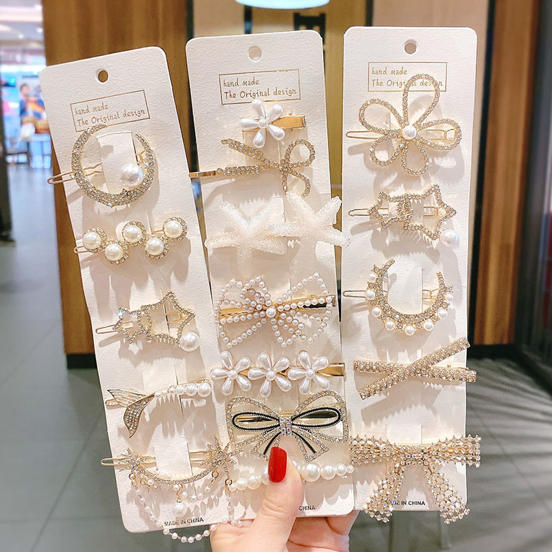 Golden pearl diamond hair clip 5 pieces of butterfly knot pearl sea star hairpin clip suit golden star 5 pieces of green water drill 6 pieces black water drill 5 pieces of caring little bear#5件套粉色水钻5件套黄色