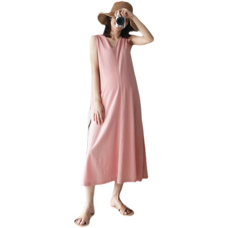 A Ma Pregnant Woman Summer Dress Dress Pure Color Minima 100 lap V collar Long paragraph Cool Sleeveless Thin-Spicy Mother Dress-Taobao