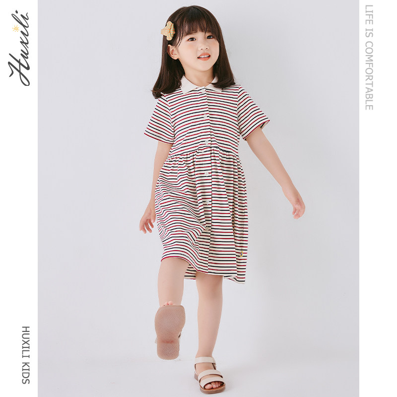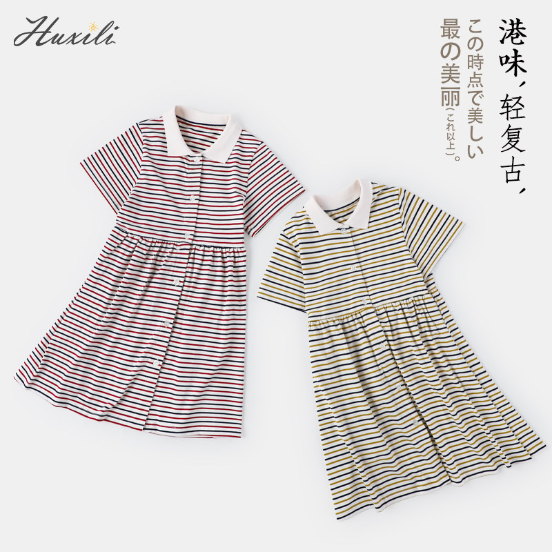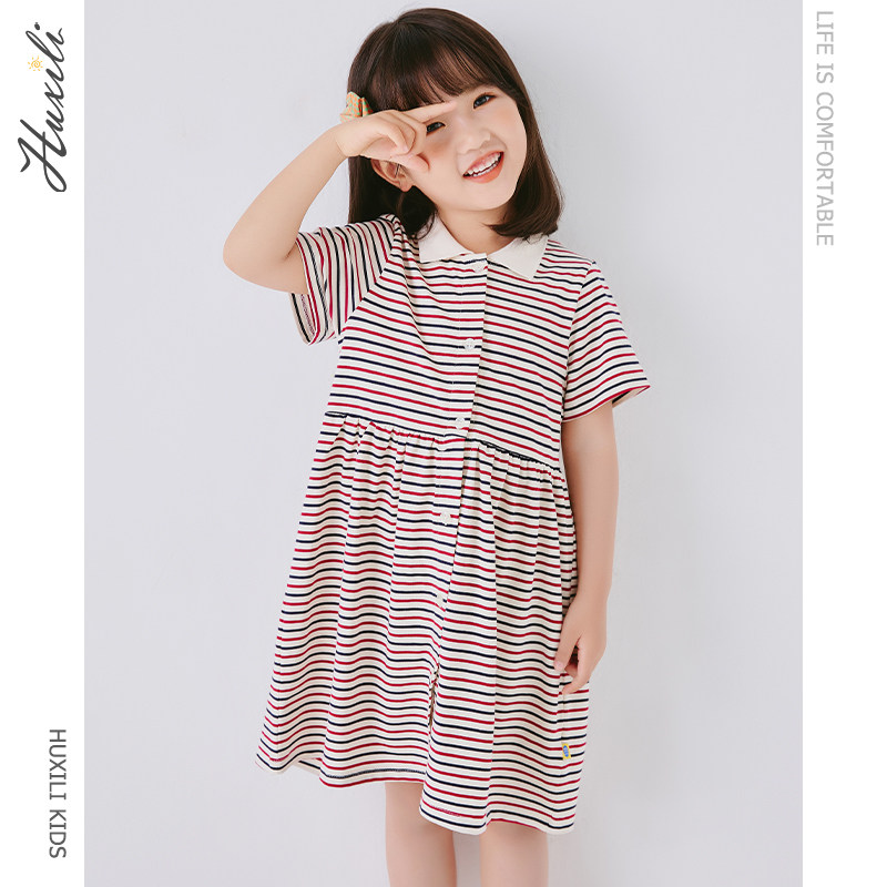 Huxili Children's Clothing Summer Girls Dress Summer Cotton Polo Collar Short Sleeve Striped Girls Lapel Shirt Skirt