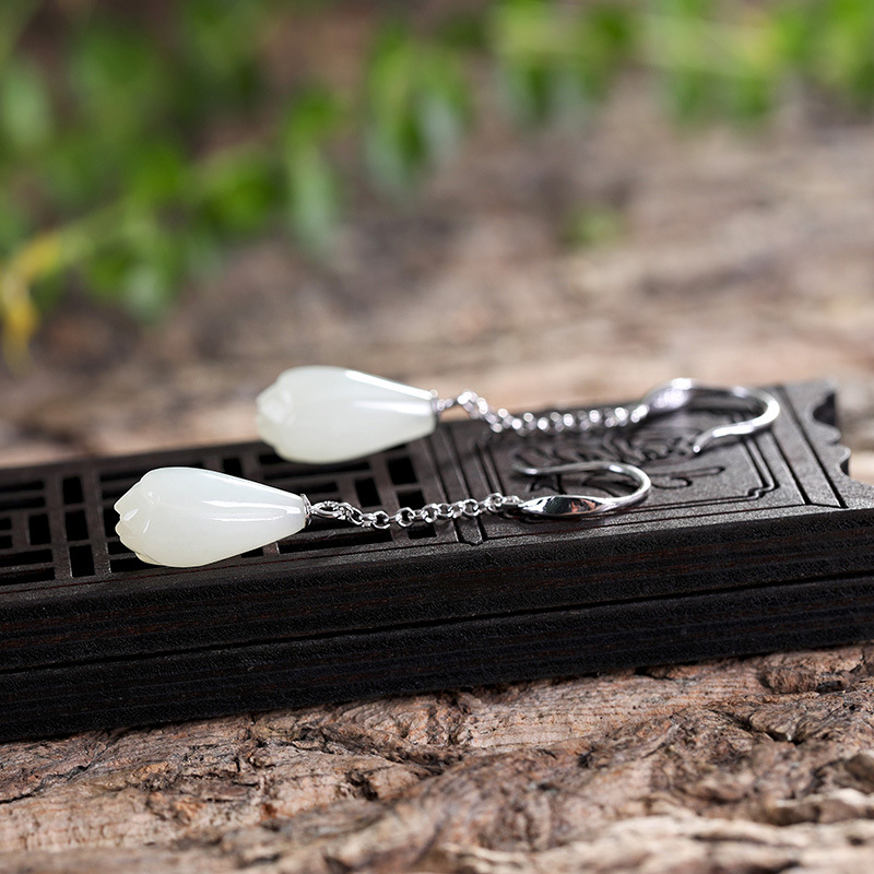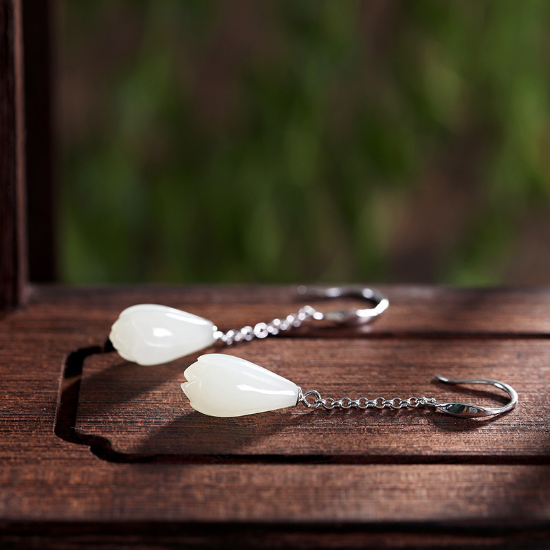 S925 sterling silver long magnolia flower earrings Hetian jade simple temperament female ancient style cheongsam national style earrings earrings