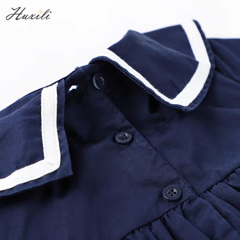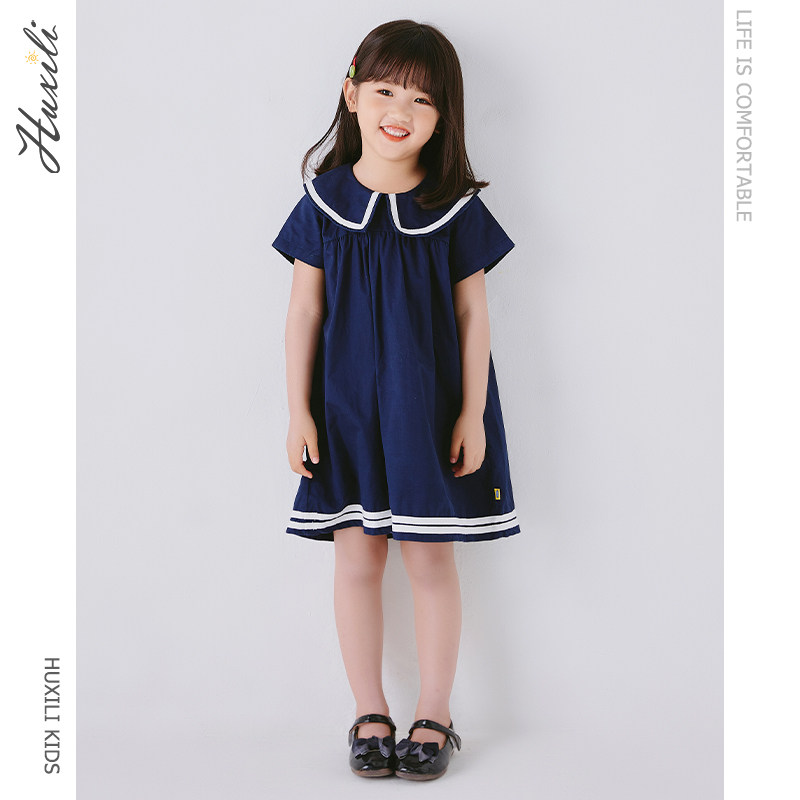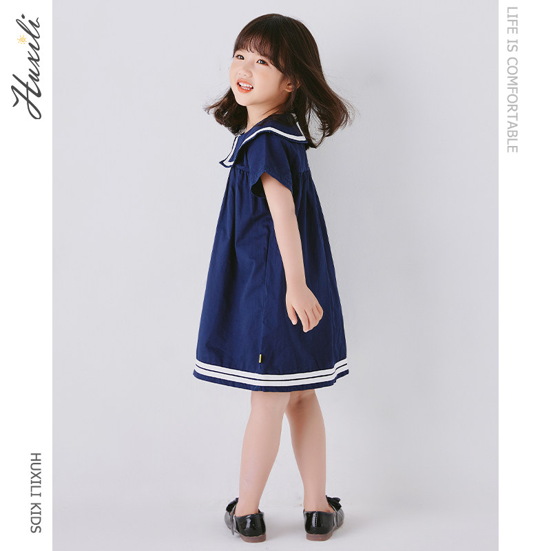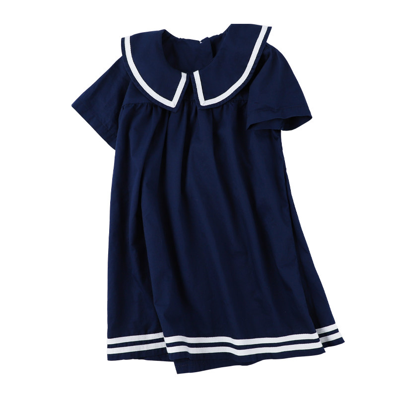 Children's clothing girls short-sleeved dress summer middle-aged boy navy style large lapel cotton contrast color wild college style skirt