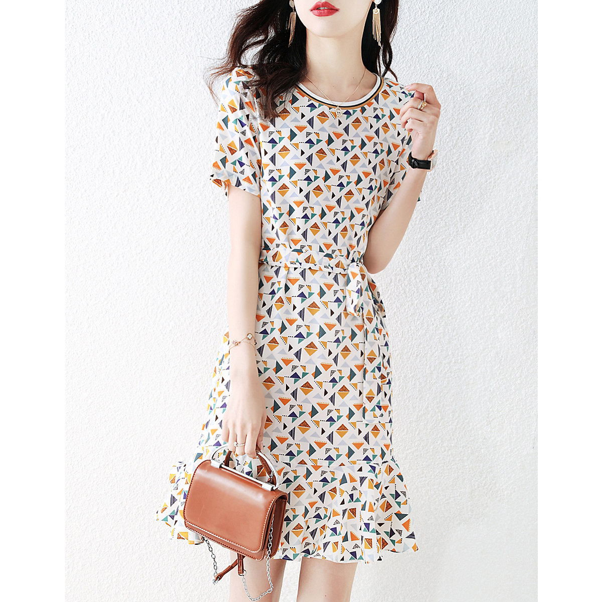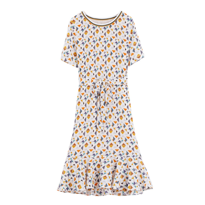 Clear - up printed dress design with a small tie with geometric pattern to collect the new models of waist summer
