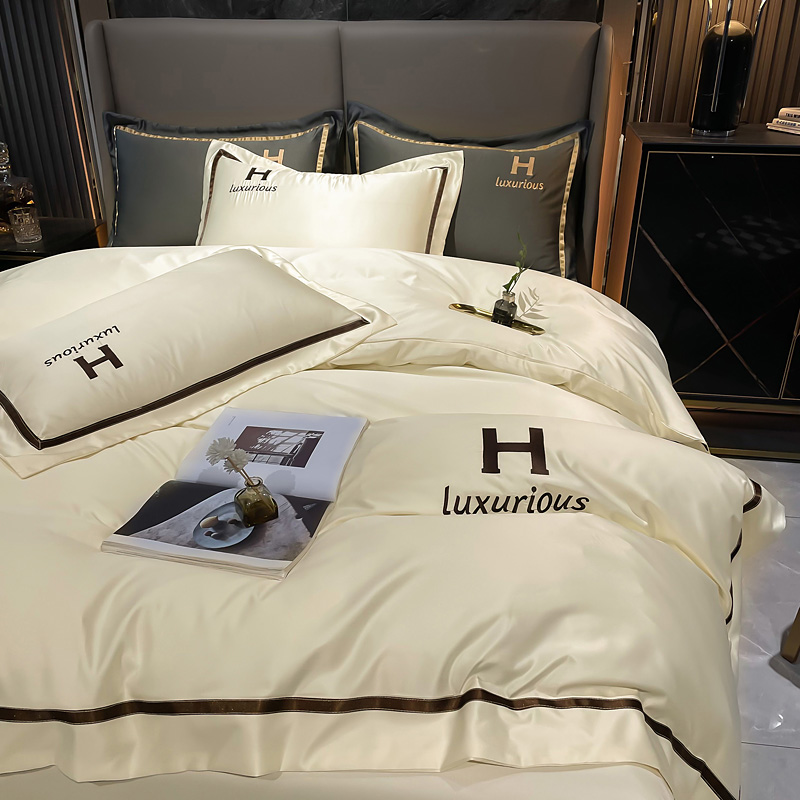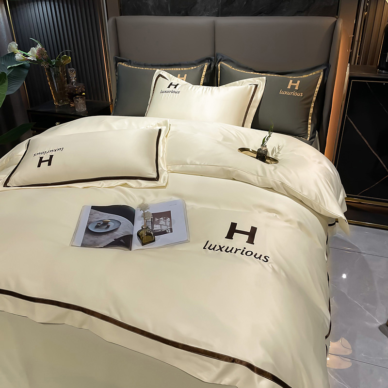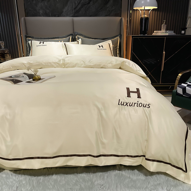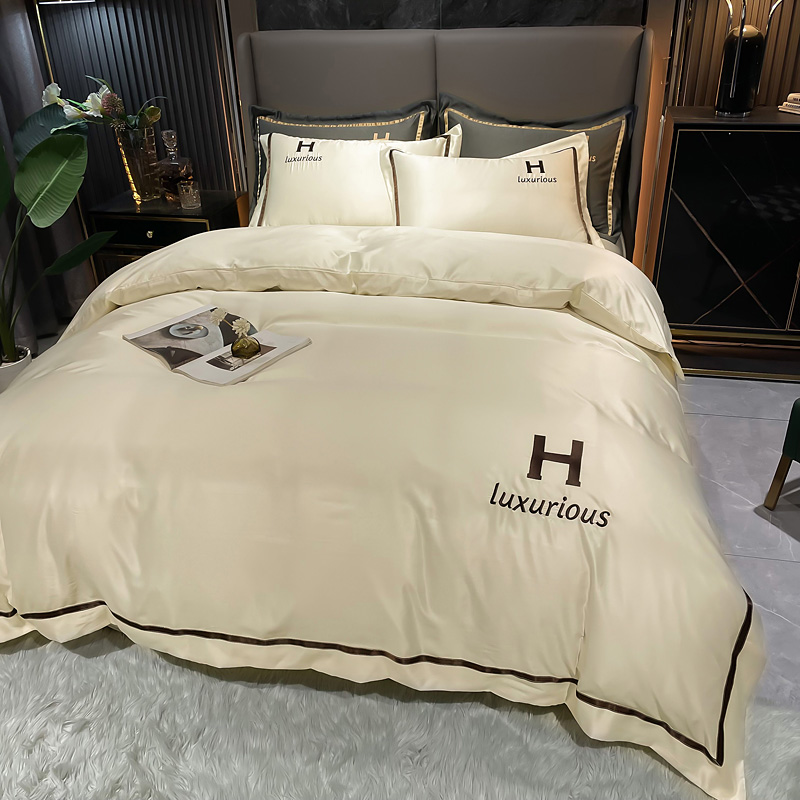 Minimalist pure colour four pieces of full cotton pure cotton linen embroidery quilt cover European-style pure color naked bed Ogasawara bed with supplies