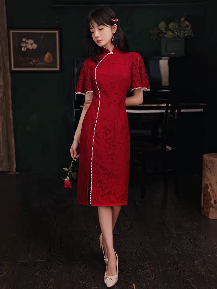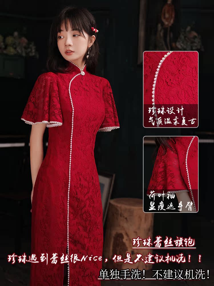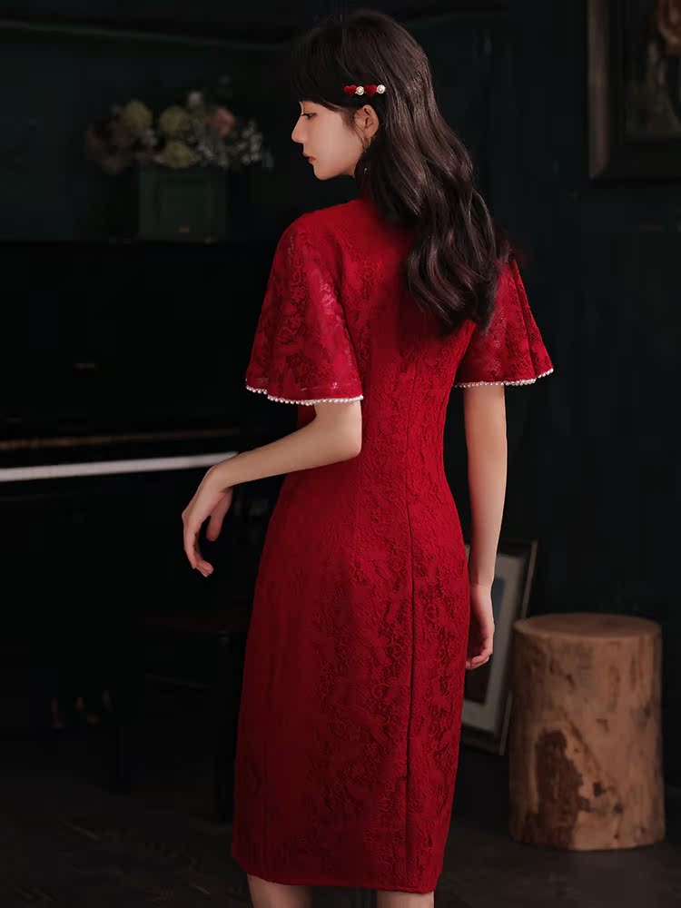Red cheongsam toast clothing bride wedding summer 2022 new engagement dress skirt female small back door lace