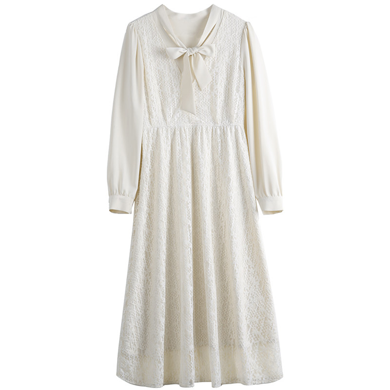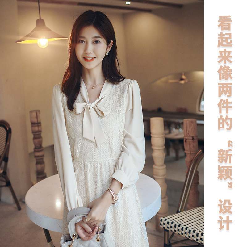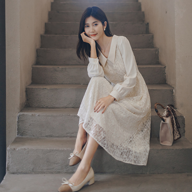 Juku long sleeve dress with dress lady 2021 new temperament gentle and thin medium long French lace dress cast-down-Taobao