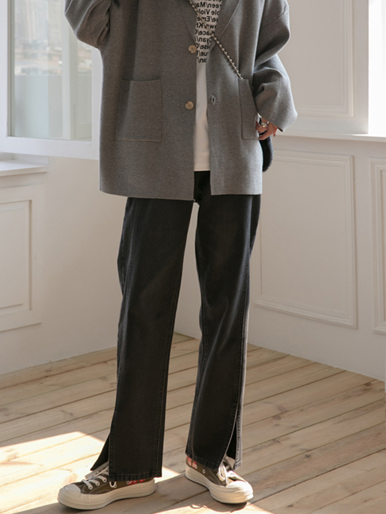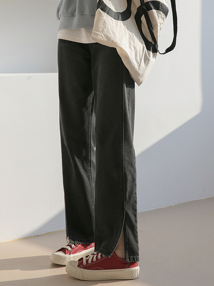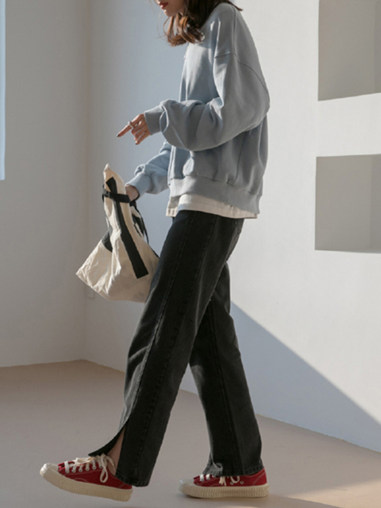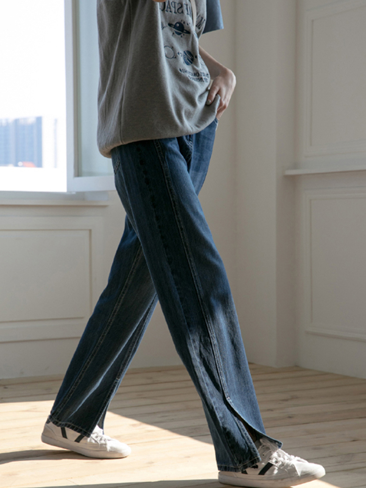 Pear-shaped figure wears large size slit denim pants fat sister mm high waist straight wide leg slit cropped pants trendy